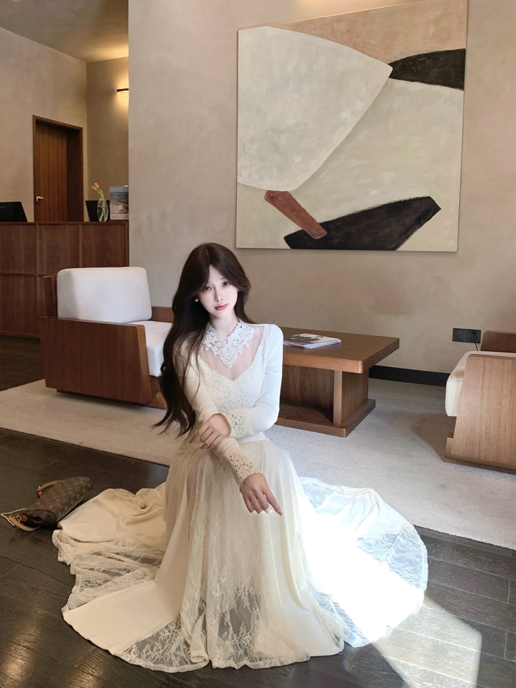 复古蕾丝拼接长袖 法式 针织连衣裙秋冬内搭白色长裙 淡香白茶 白里