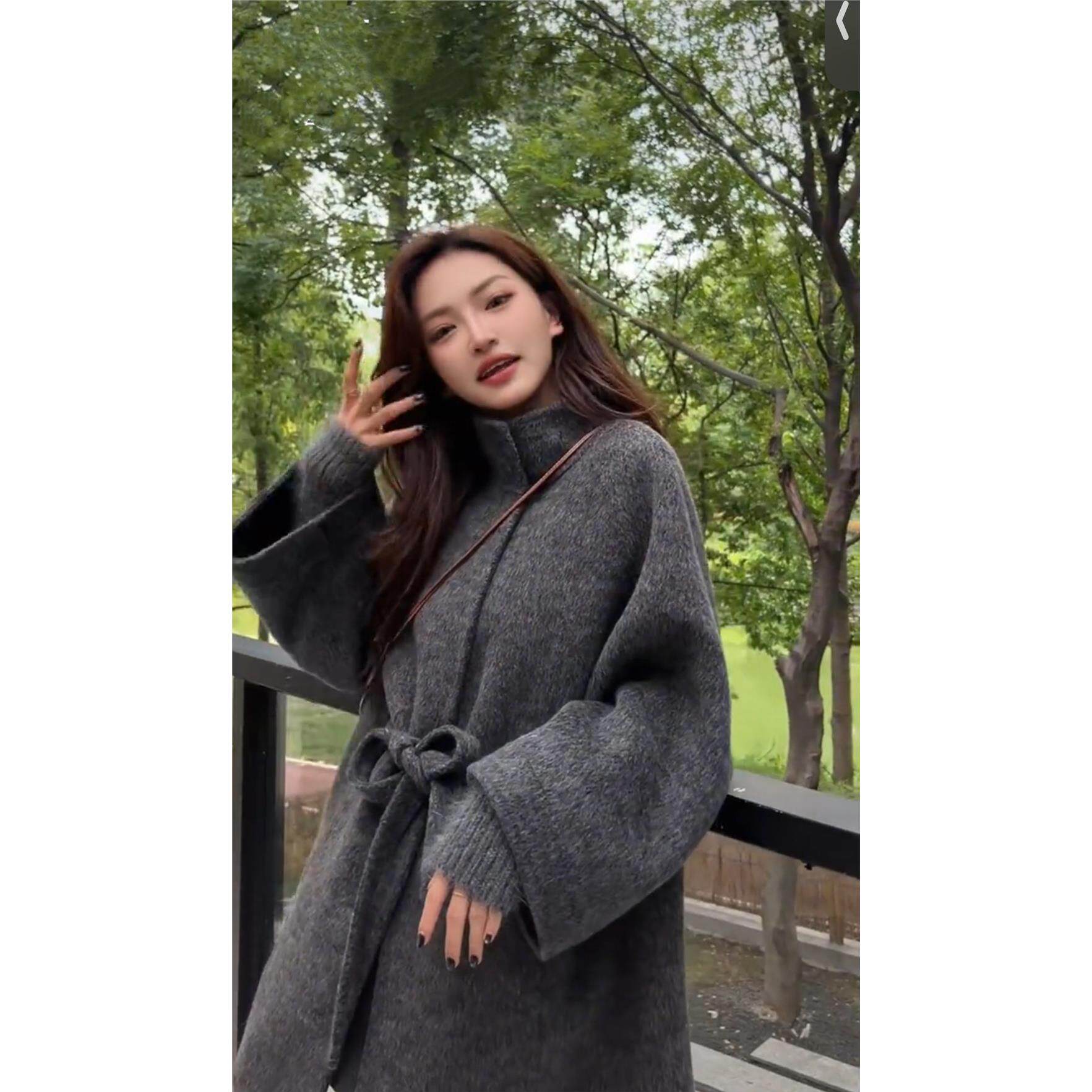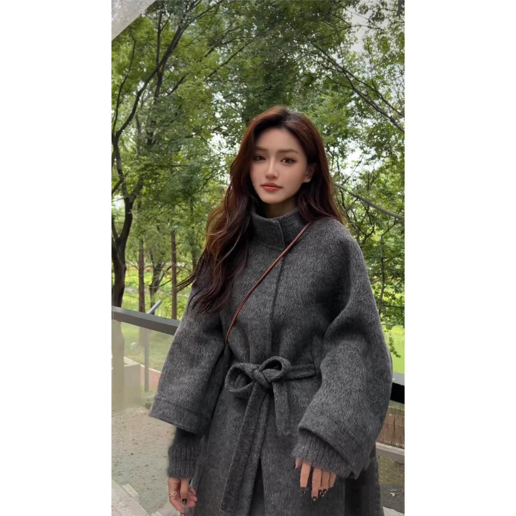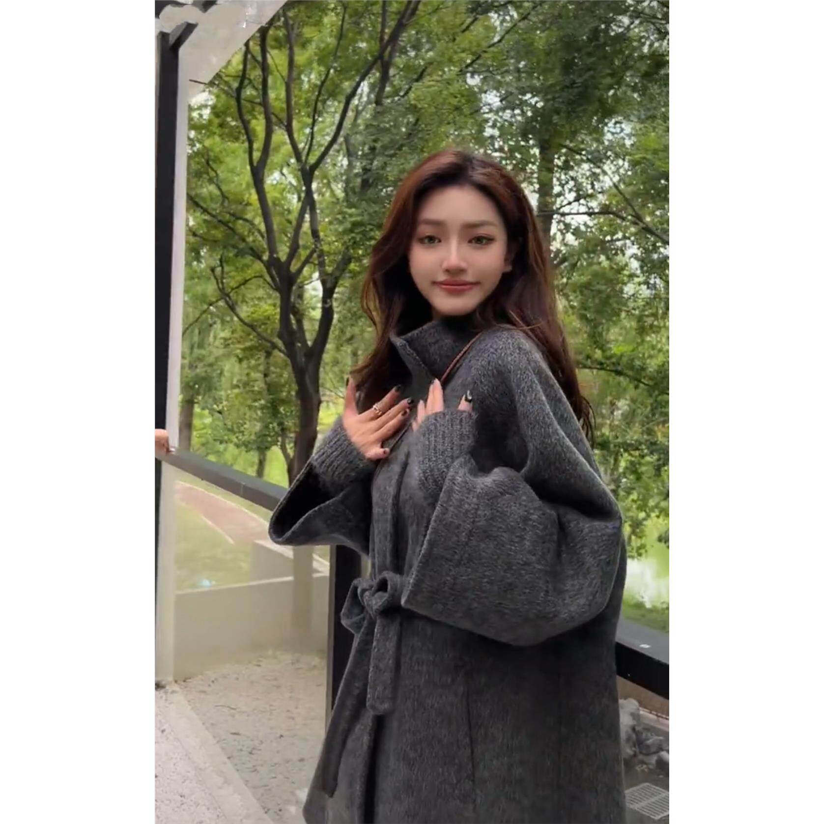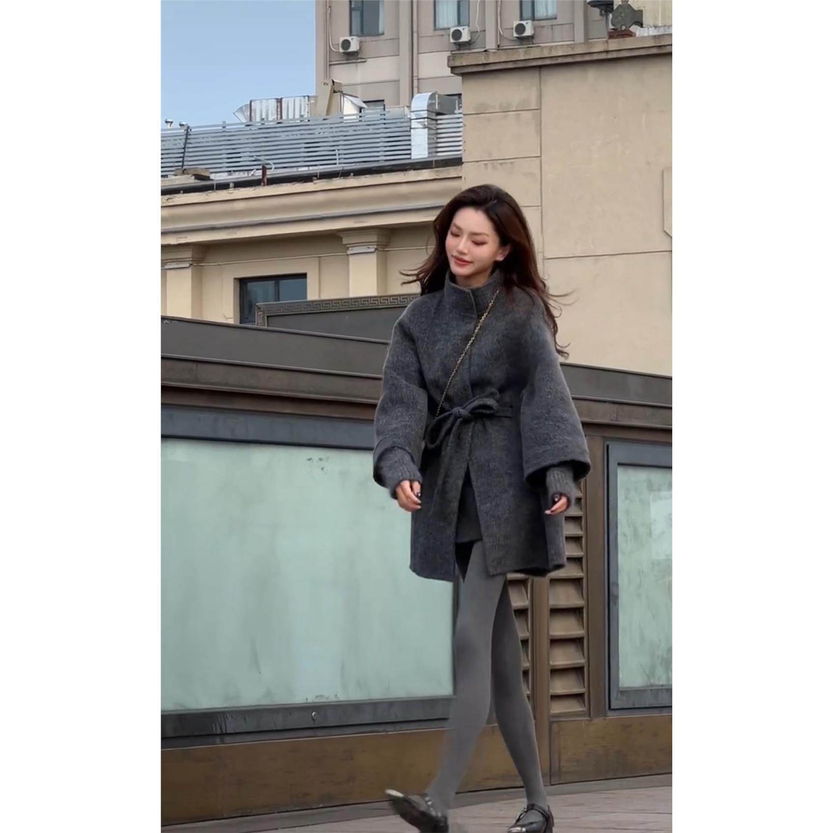 羊毛呢外套女 立领双面羊毛大衣系带假两件针织袖 2025秋季 斗篷新款