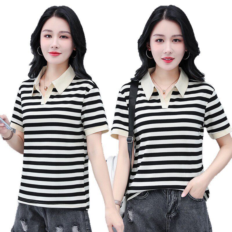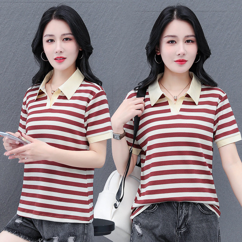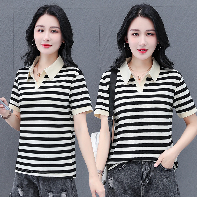 百搭时尚 夏季 条纹POLOT恤日常简约休闲洋气减龄短袖 95棉5氨纶