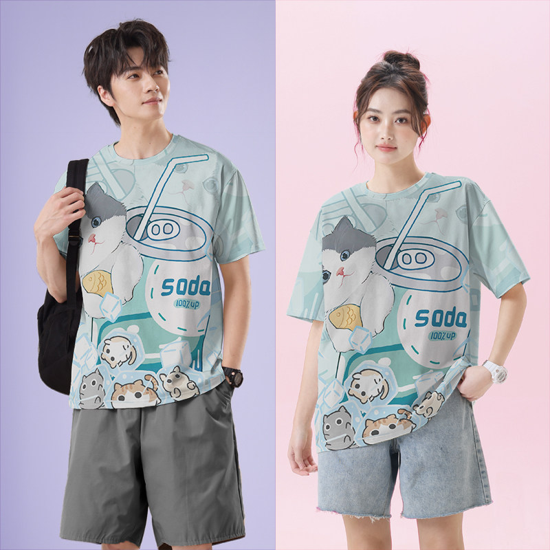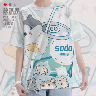 0015设 女装 无界 速干T恤男装 原创可爱蓝白猫咪青柠苏打水卡通大码
