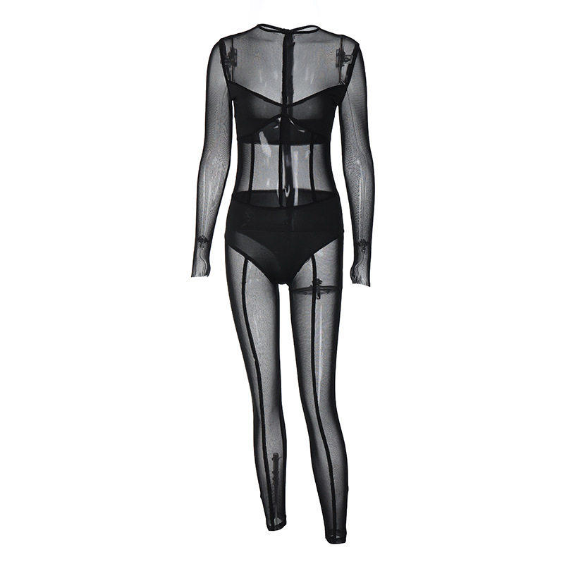 pants jumpsuit长袖 网纱长裤 Long 性感连体裤 mesh 修身 sleeved