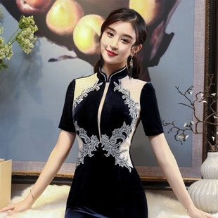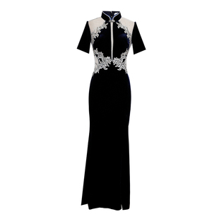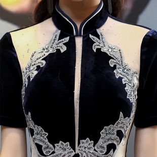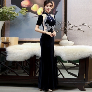 优雅演出服女 藏青色改良长款 丝绒年轻款 高端走秀旗袍2025年新款
