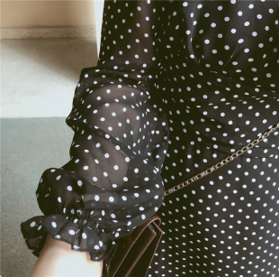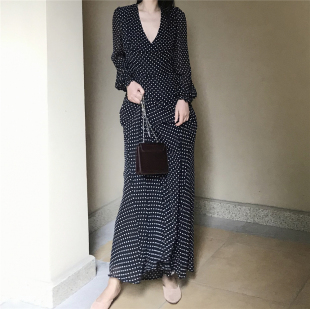 波点雪纺长袖 到脚踝内搭裙子 v领长裙 超长款 读衣术高个子连衣裙
