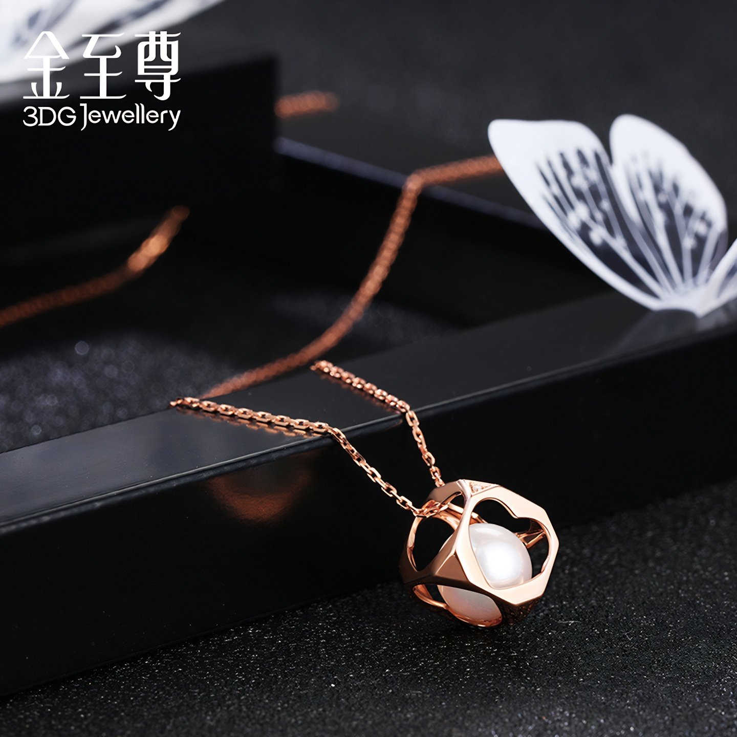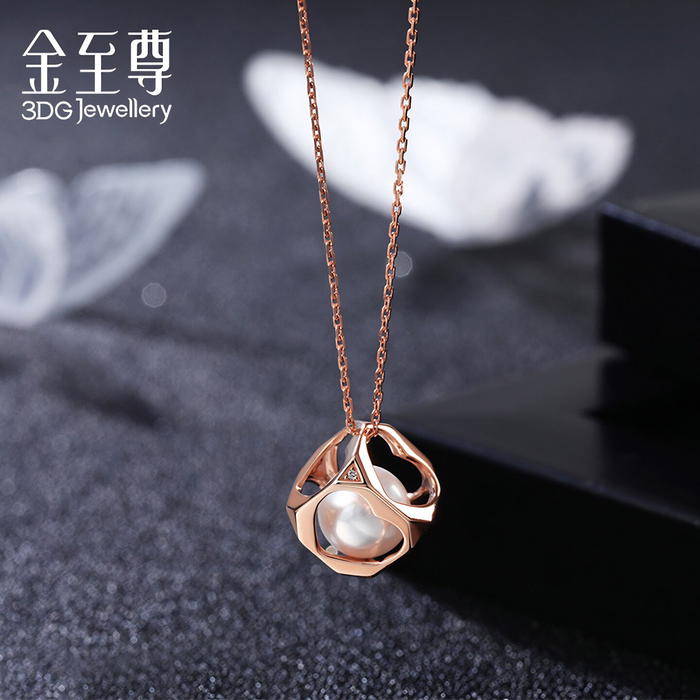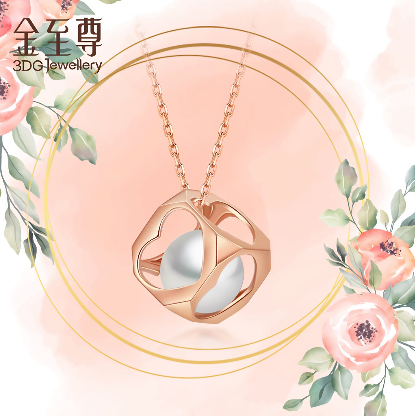 金至尊醉迷人玫瑰金心形18K红金珍珠钻石项链女送老婆纪念日礼物