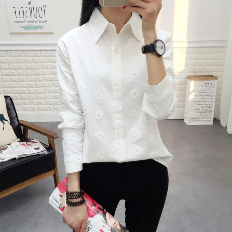 学生大码 女长袖 宽松白衬衣碎花上衣 小清新韩范棉麻衬衫 春秋新款