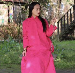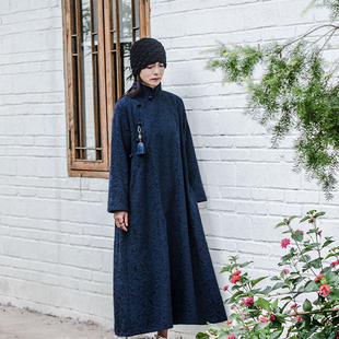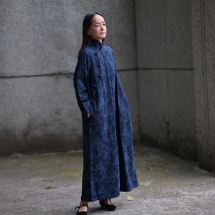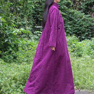 立领禅意秋棉麻长袍 中式 复古盘扣提花袍子 a型超长超宽松连衣裙