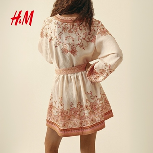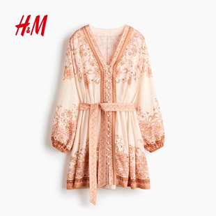 系带宽松海边穿搭连身裙1321000 V领灯笼长袖 HM女装 连衣裙2026新款