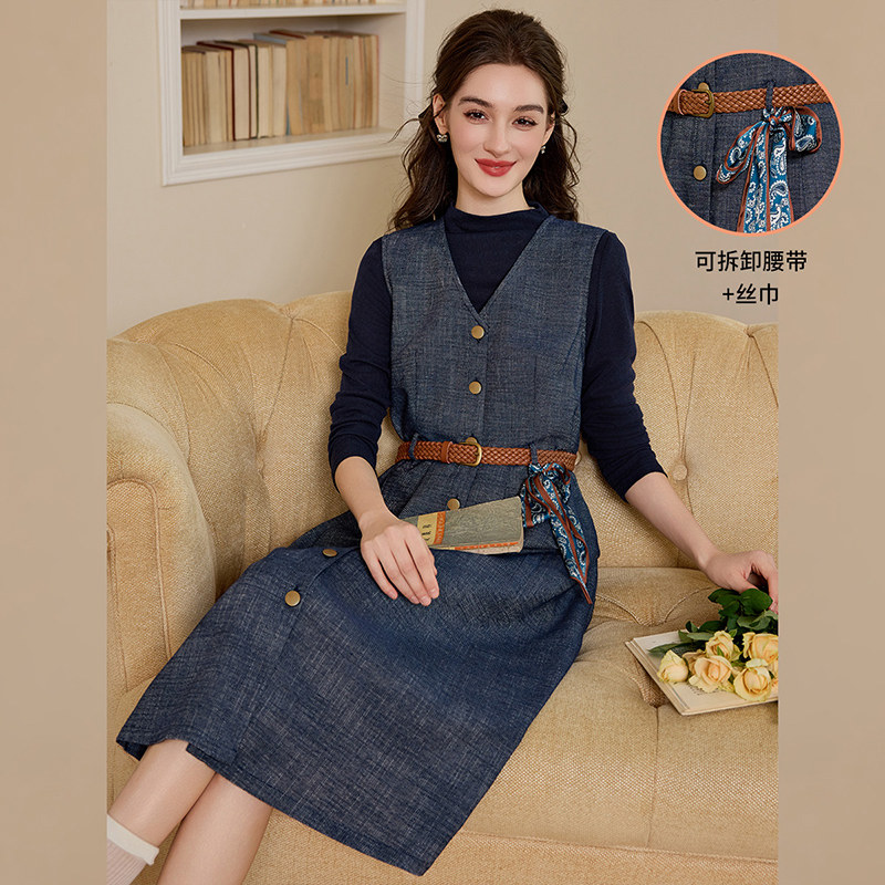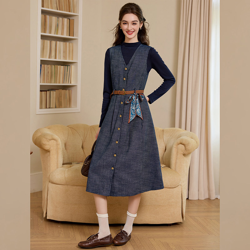打底衫 长袖 背带裙牛仔连衣裙 气质休闲复古牛仔2件套女修身 白鹿语