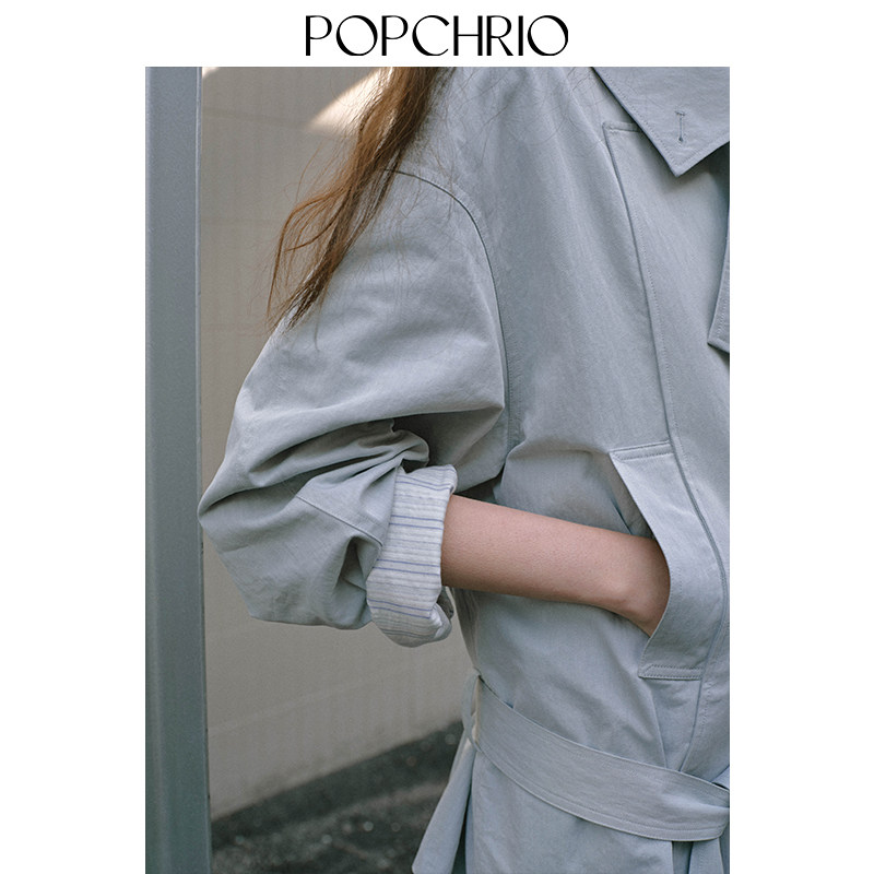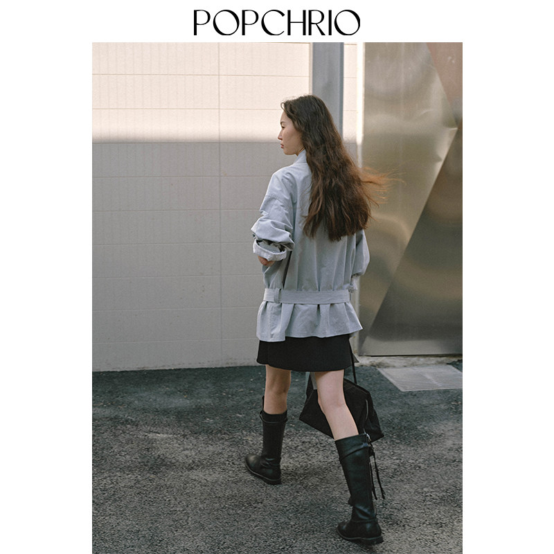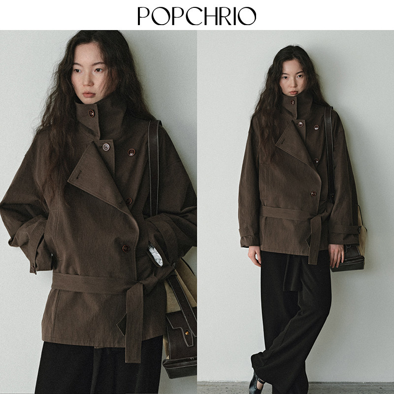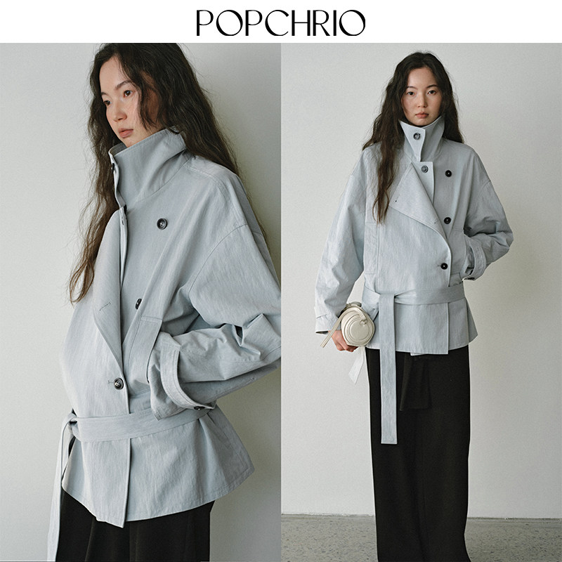 POPCHRIO欧可芮 棉风衣宽松小个子系带外套女 松弛感叠片低腰短款