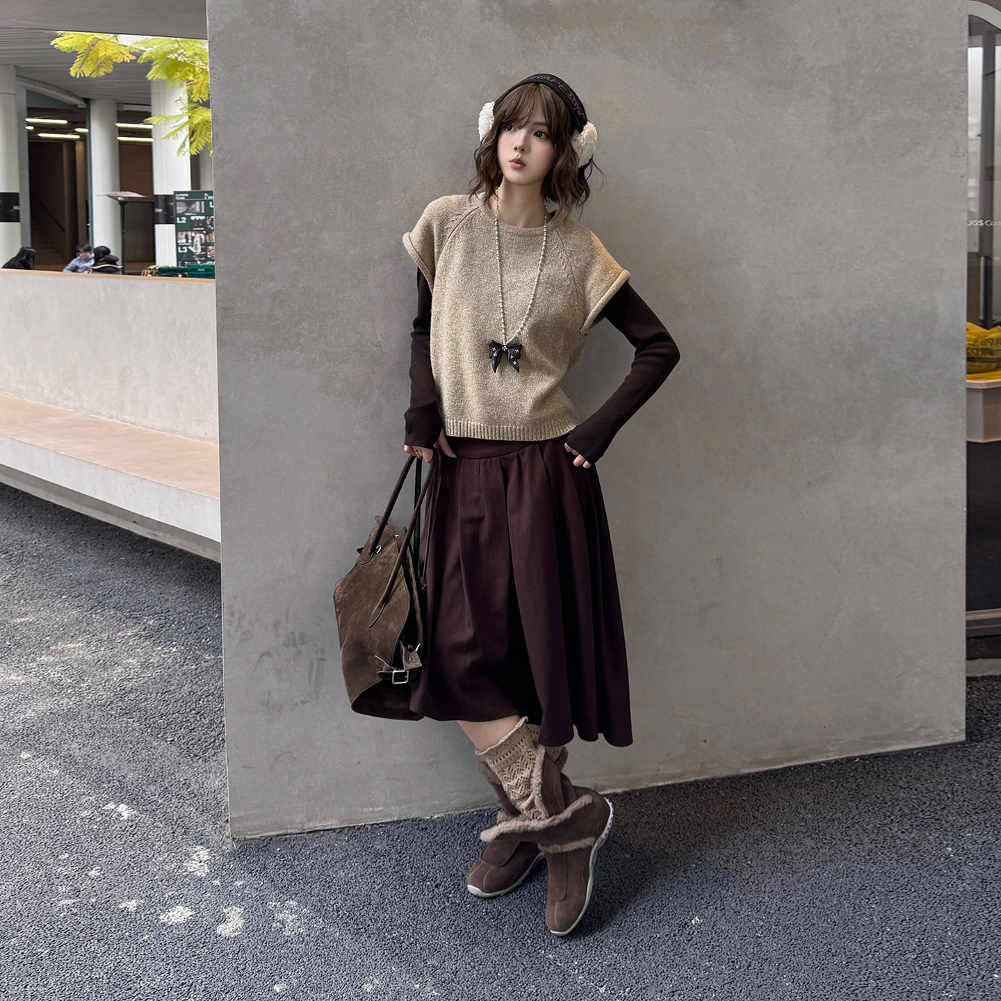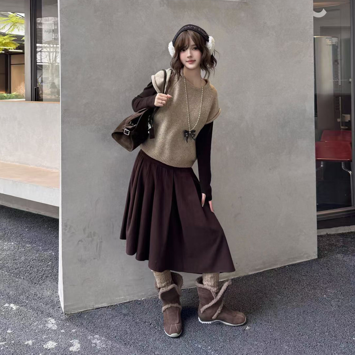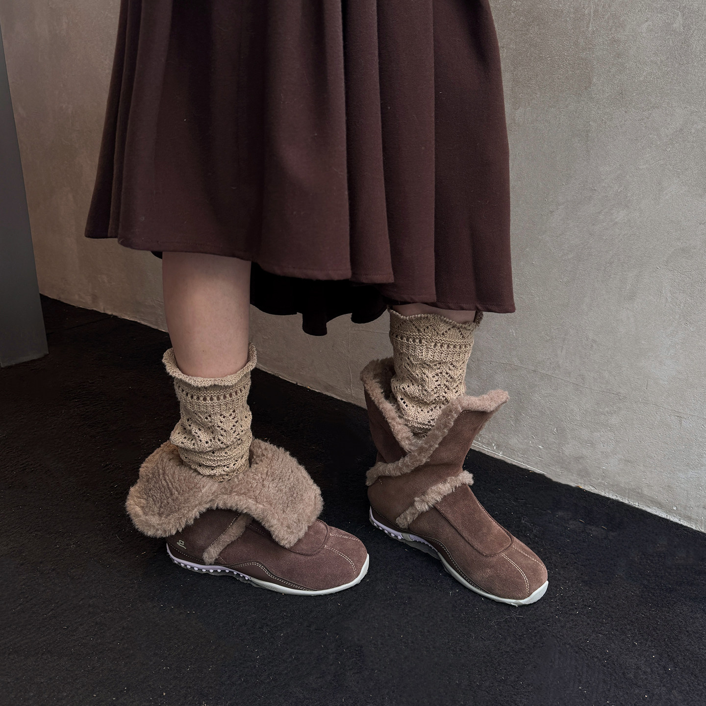 GRAPE 棕色羊羔毛两穿篮球短靴平底毛毛雪地靴M星店 2026新款