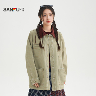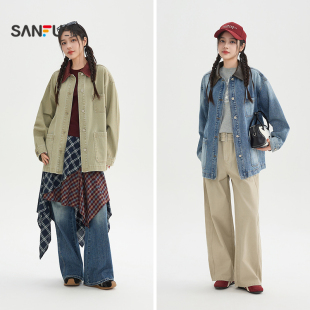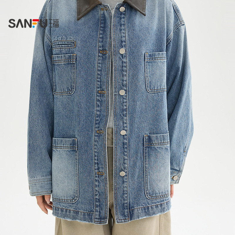 街潮皮翻领拼接宽松上衣女装 时尚 517591 春季 三福牛仔外套2026新款