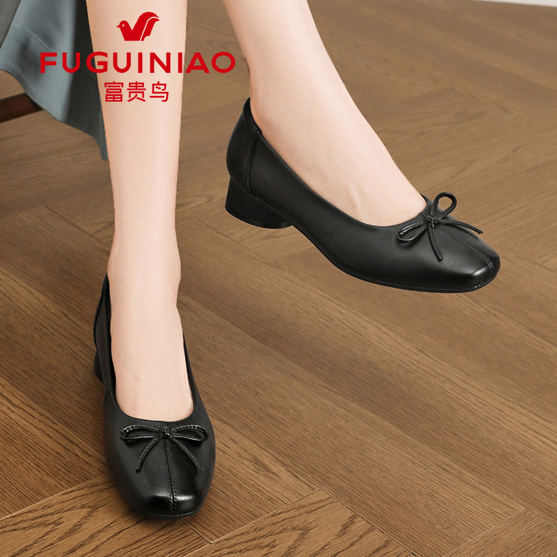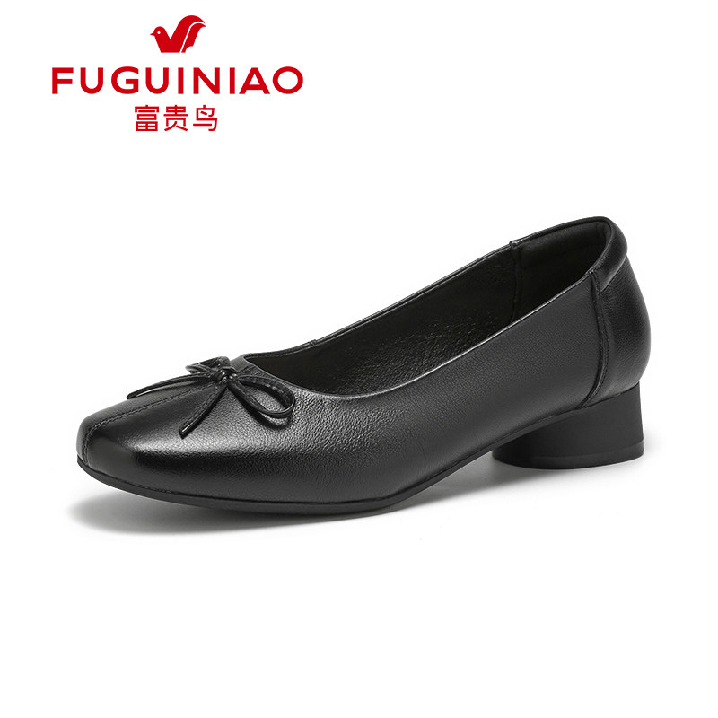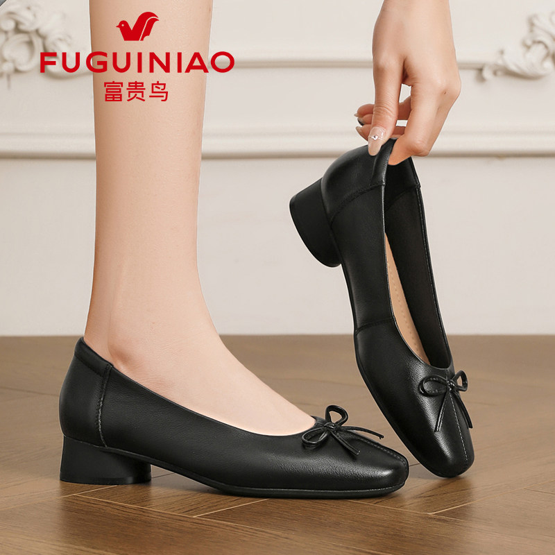 女黑色 真皮软底全牛皮职业工作高跟皮鞋 富贵鸟女鞋 上班不累脚单鞋