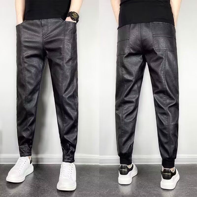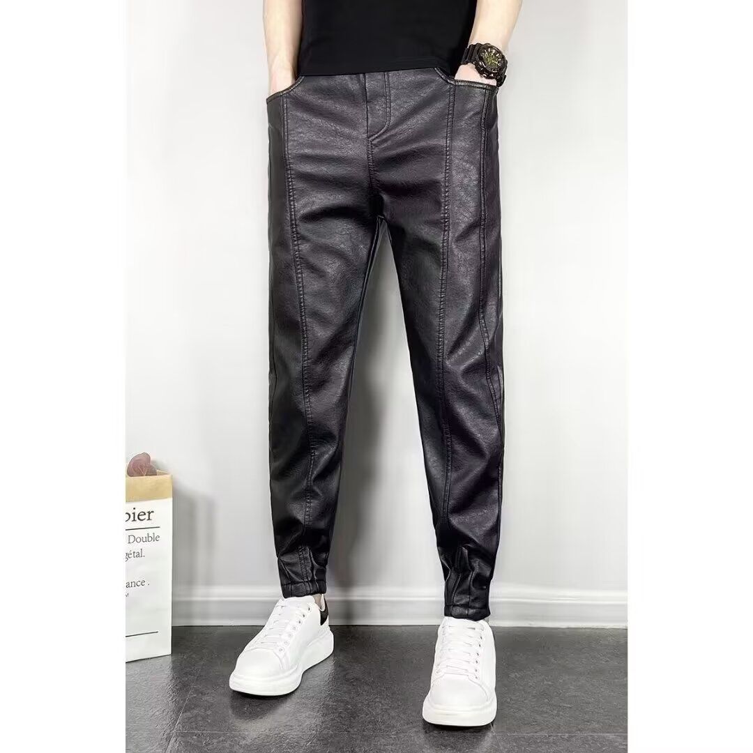 外卖机车骑手潮流纯黑色防风加厚休闲长裤 加绒保暖皮裤 男士 秋冬季