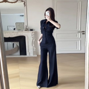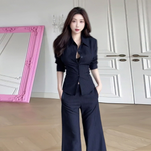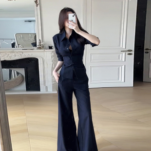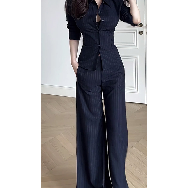 轻熟风套装 长裤 气质polo领长袖 喇叭休闲裤 条纹衬衫 御姐职业正装