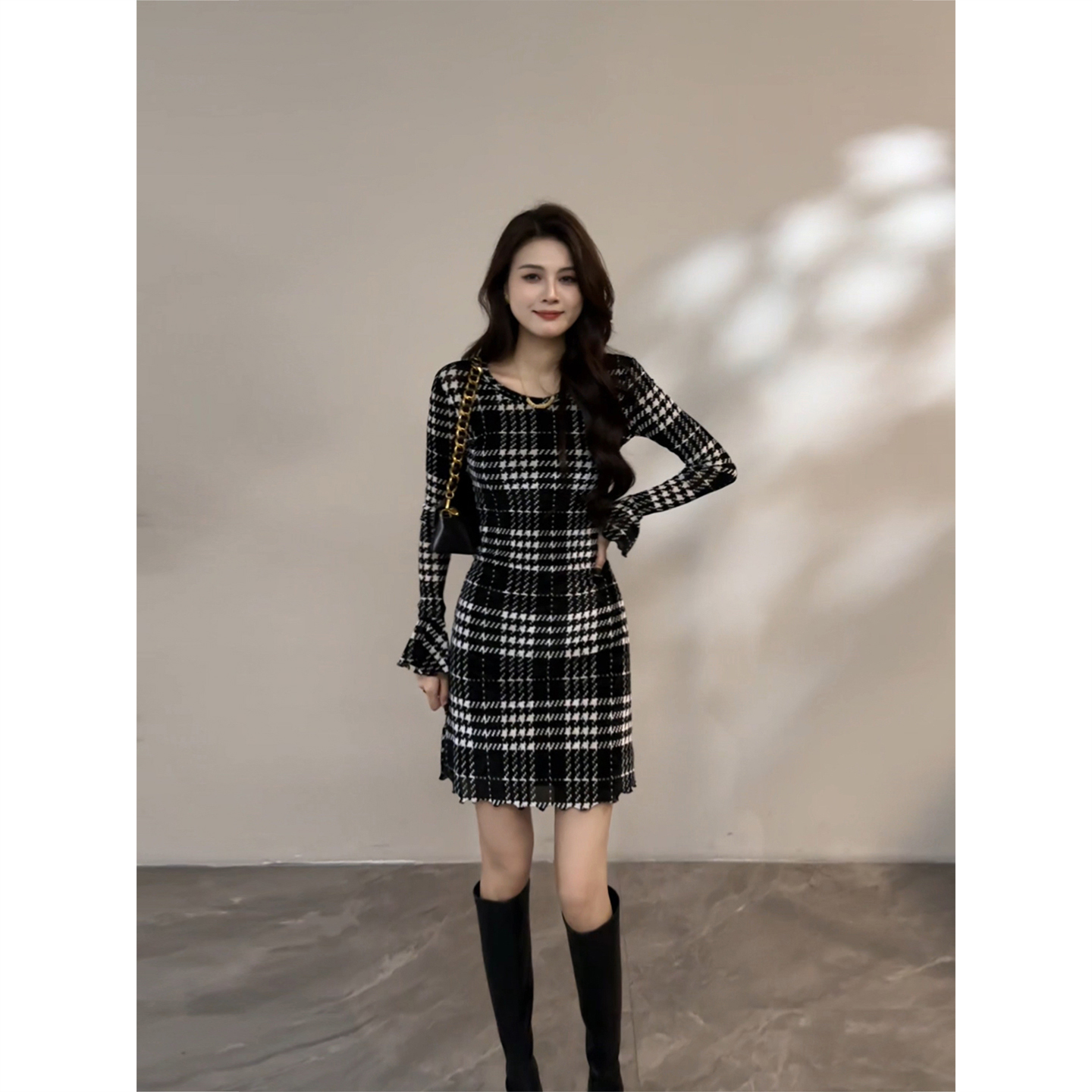 名媛风千鸟格格子连衣裙显瘦小香风女装 秋季 DT1619 长袖 大婷婷