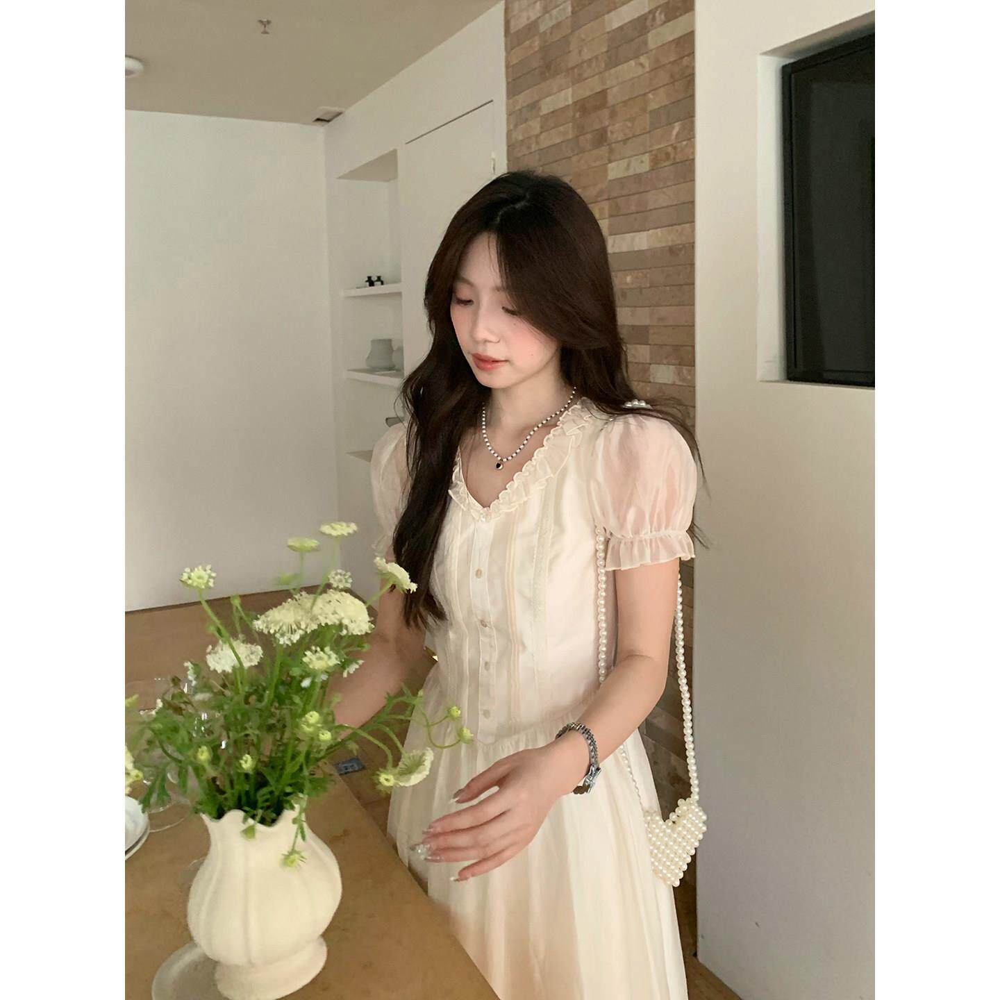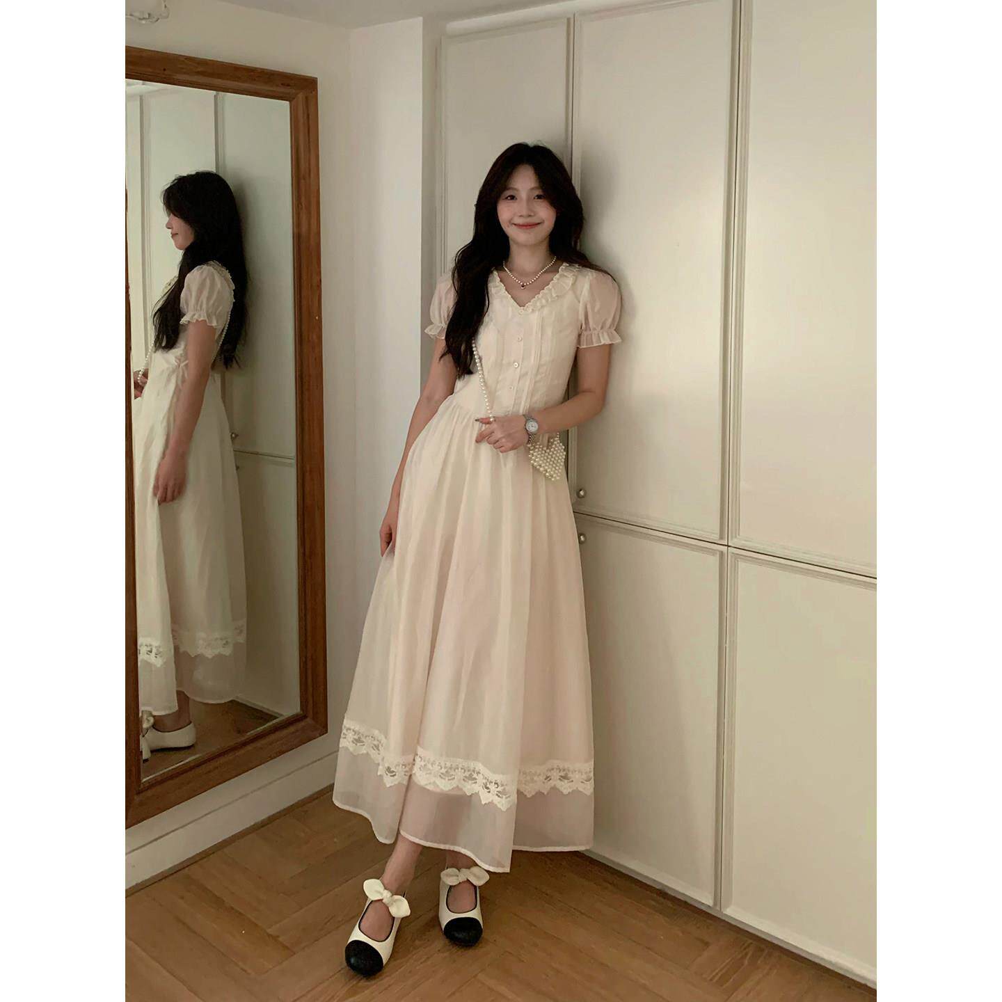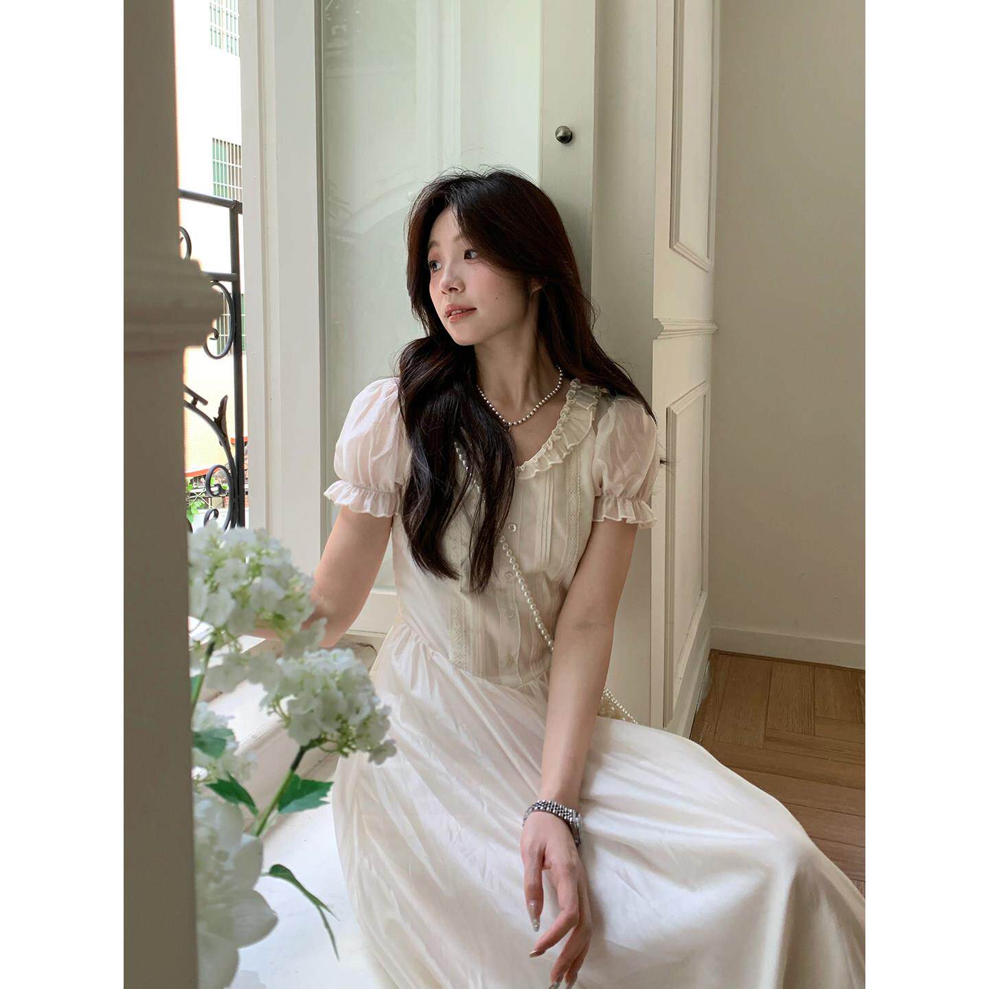Even一雯 韩系高智感荷叶领连衣裙女夏温柔风收腰长裙 白日香槟