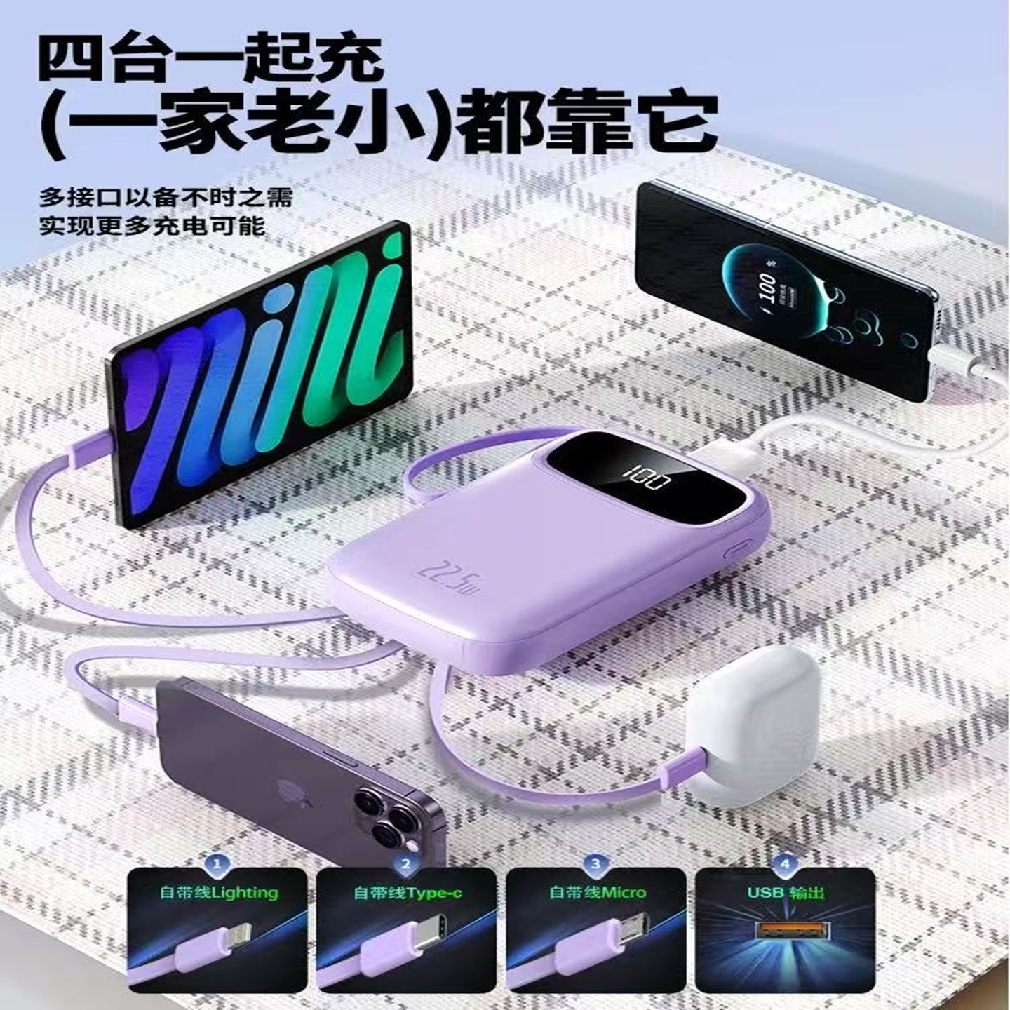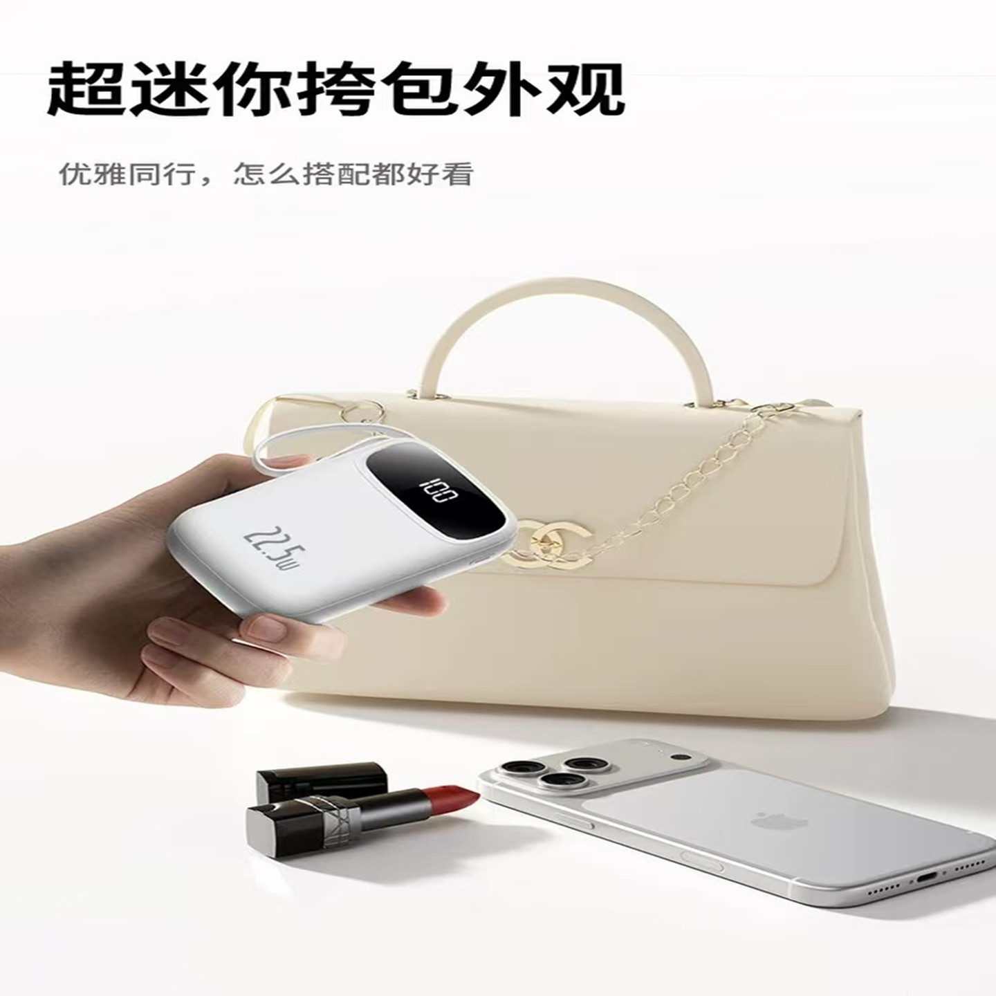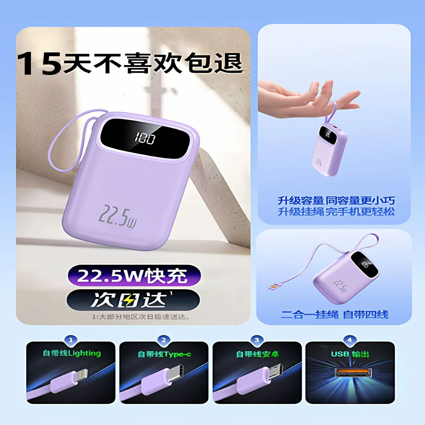 22.5W自带线双向快充小巧超大容量便携移动电源适用于华为小米苹果15手机 小米自带线充电宝20000 3C认证