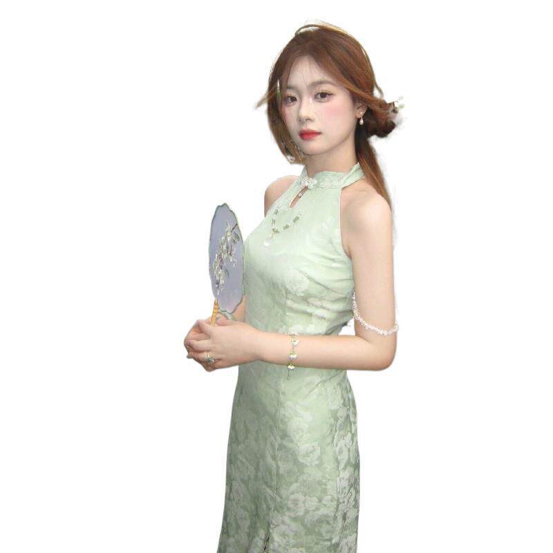 新中式 国风清冷感绿色改良旗袍性感风情万种绝美挂脖连衣裙女夏季