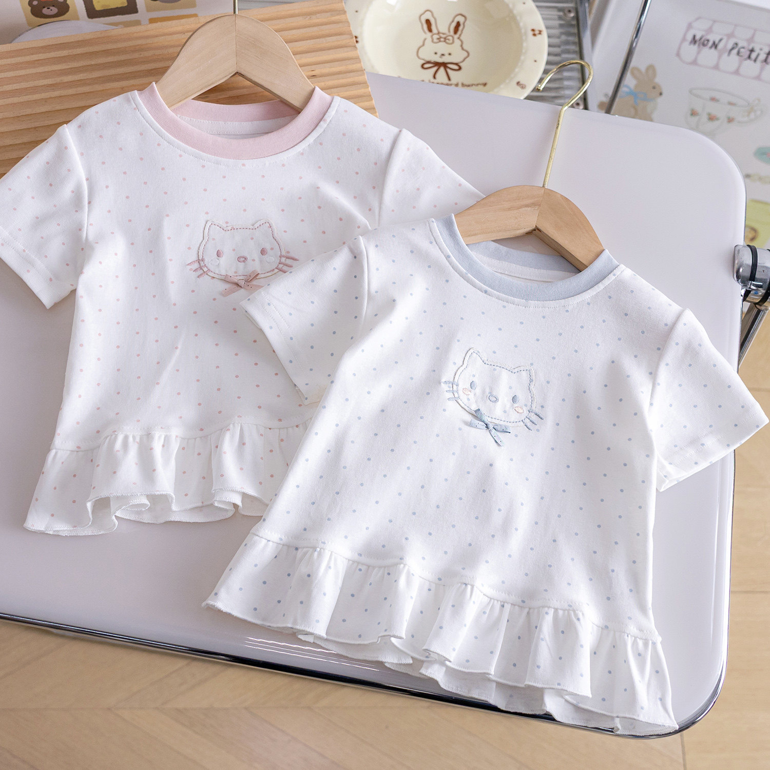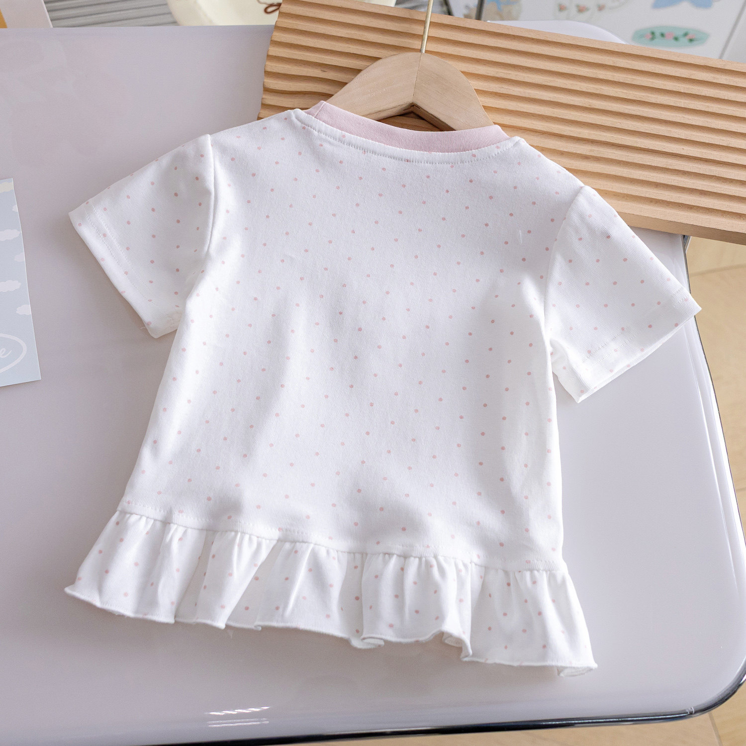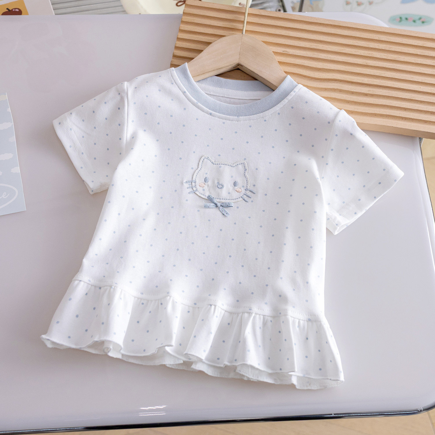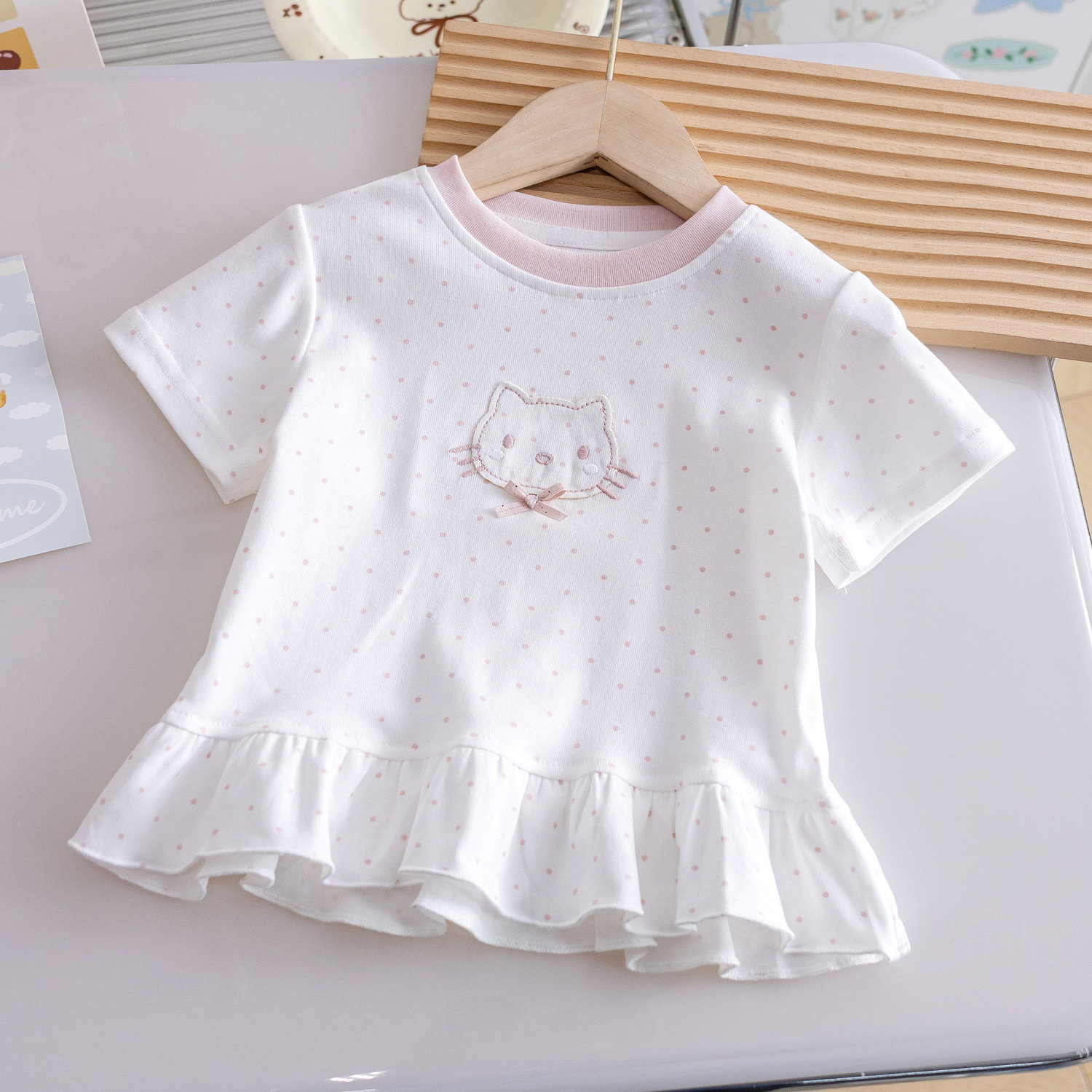 洋气圆领女宝波点花边亲肤上衣3 卡通绣花可爱T恤夏季 女童新品 短袖
