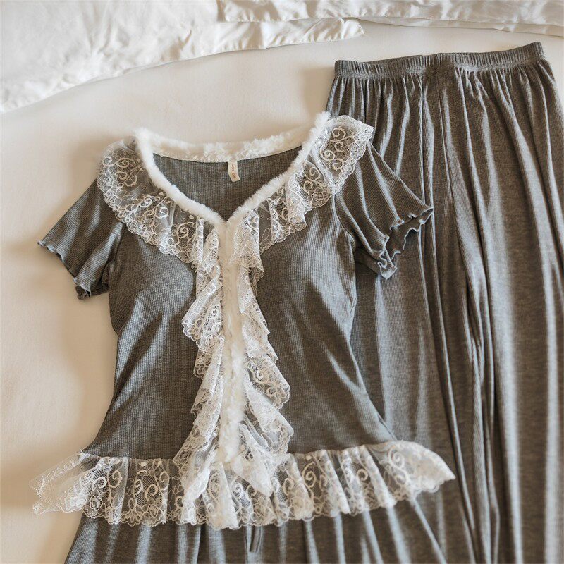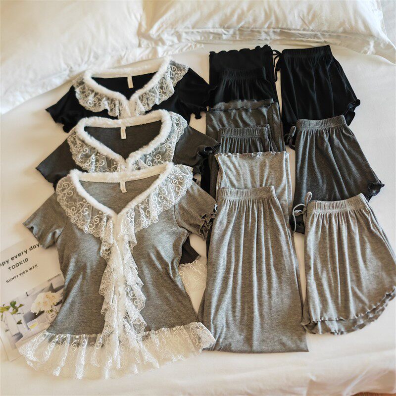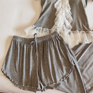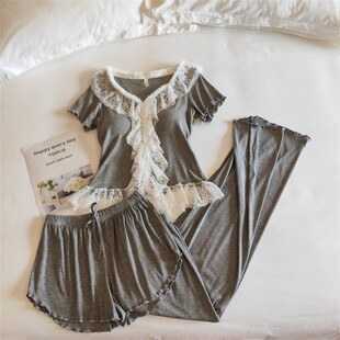 莫代尔奢华家居服毛边显瘦韩版 纯欲夏季 三件套 睡衣女千金法式 新款