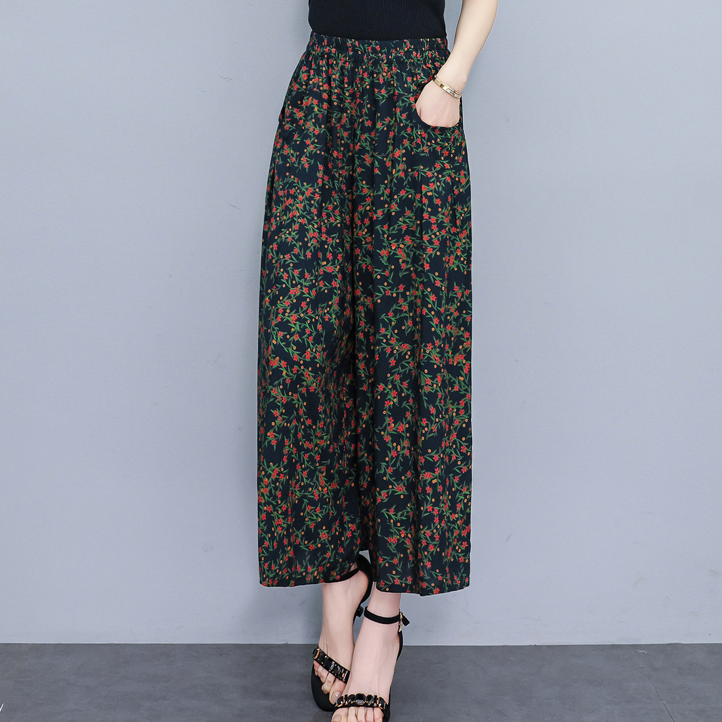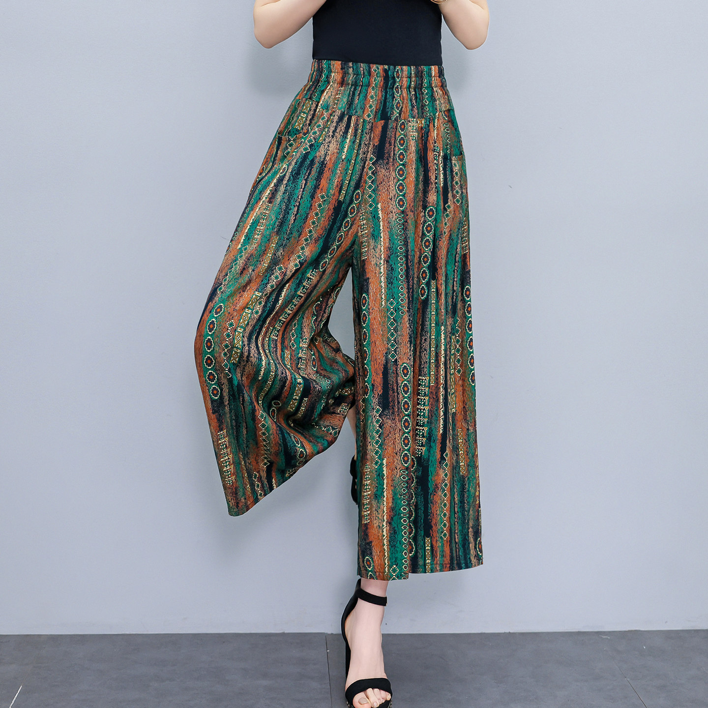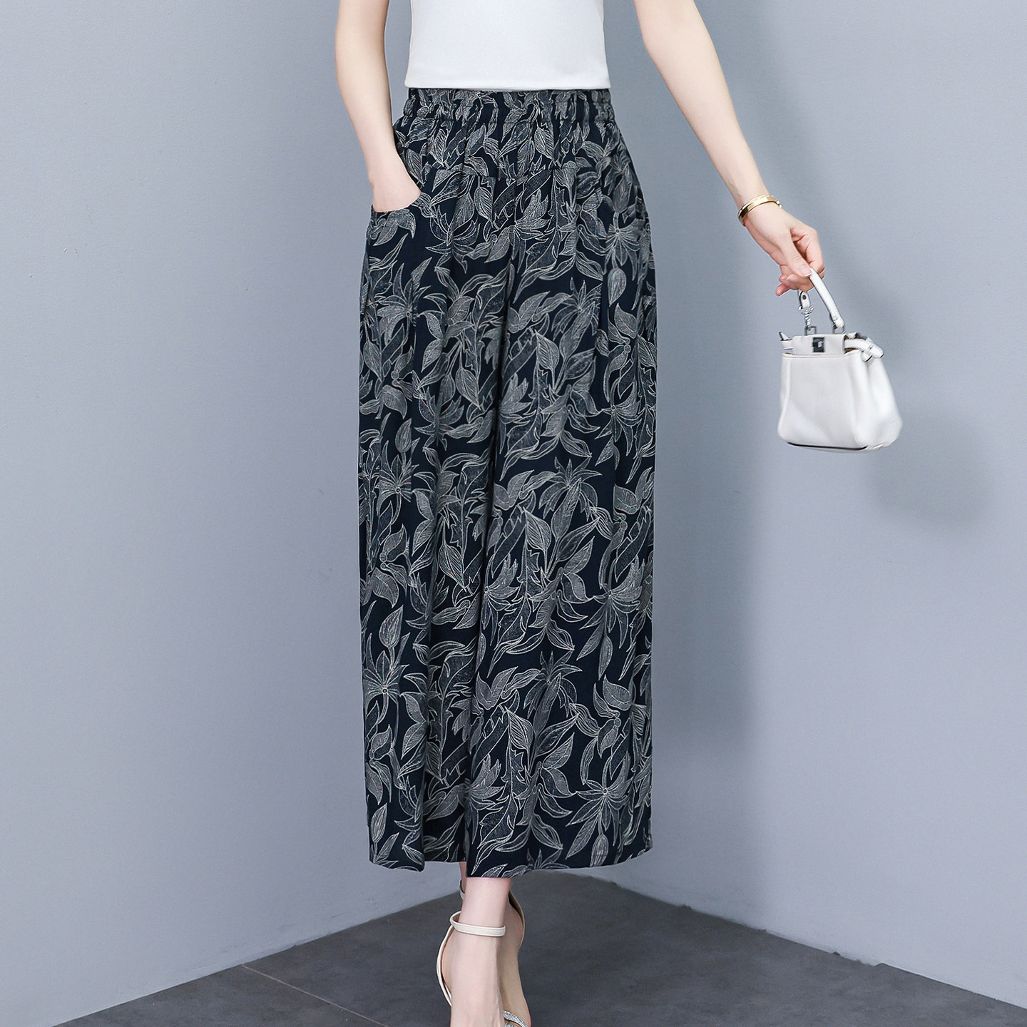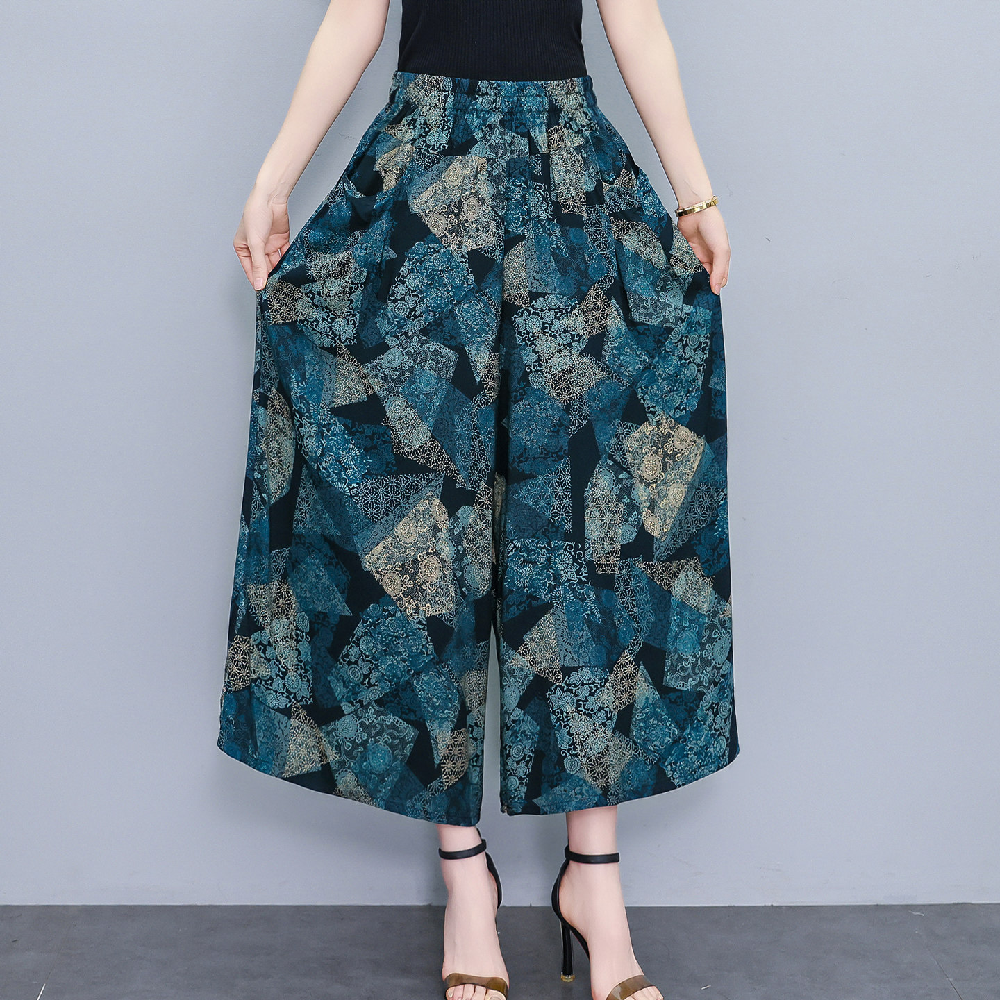 棉绸阔腿裤 印花裤 女九分裤 松紧腰夏季 子 宽松显瘦大码 中老年妈妈装