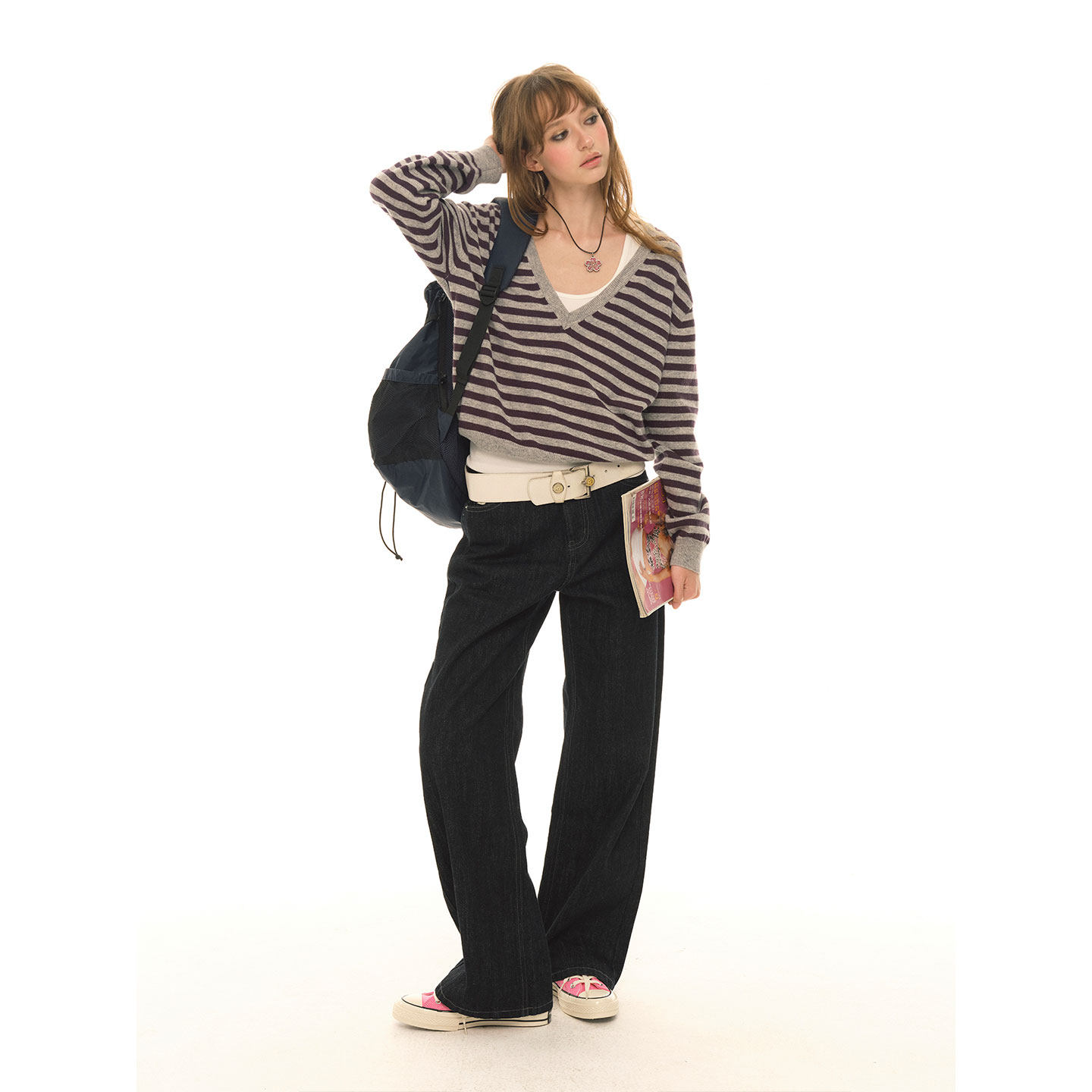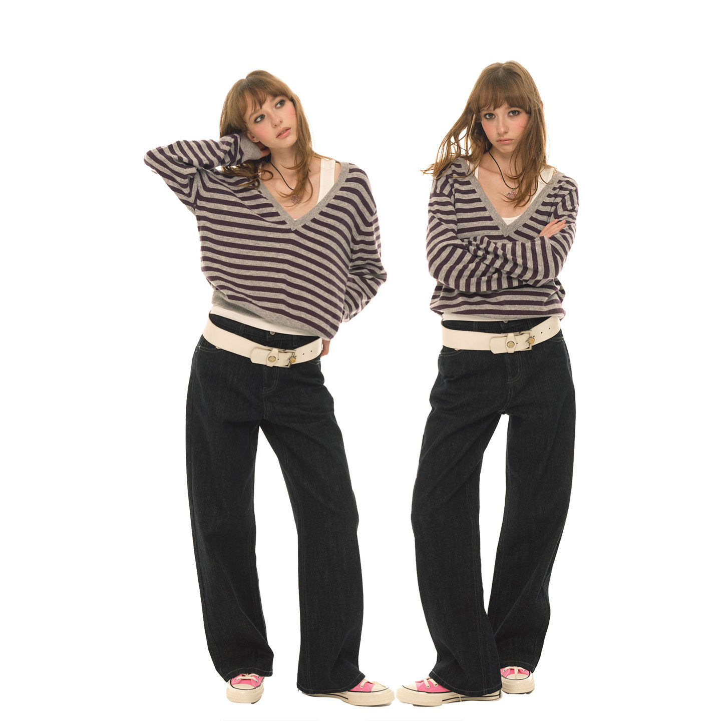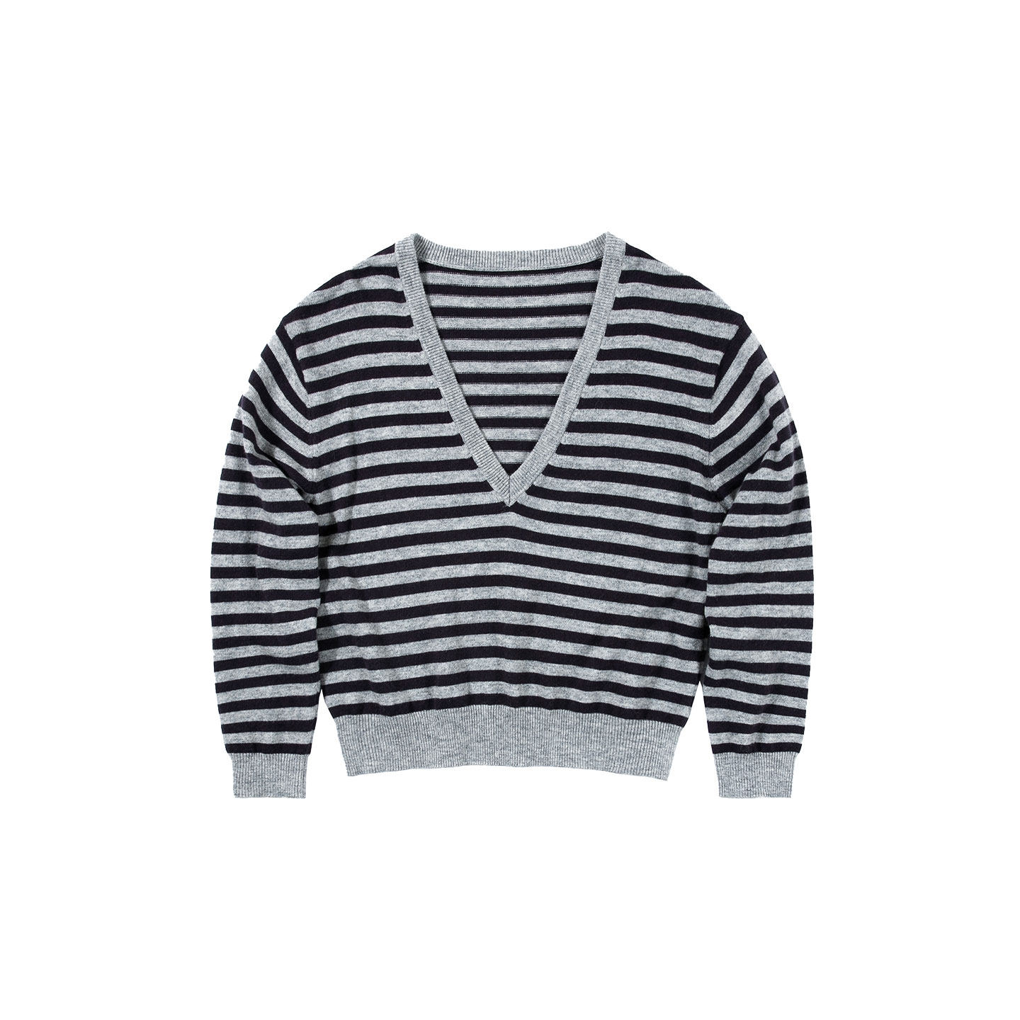 毛衫 女羊毛混纺条纹毛衣秋冬长袖 上衣 复古大V领针织衫 UNRETRO美式