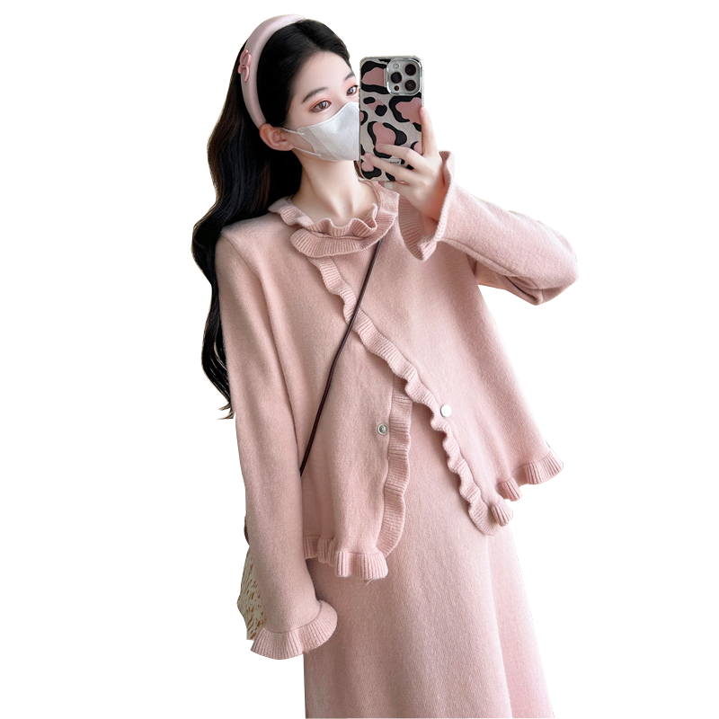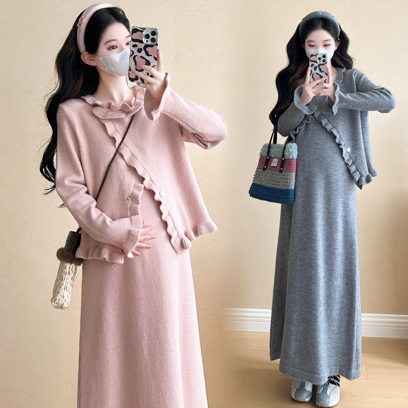 秋冬款 外套两件套潮妈装 针织连衣裙套装 木耳边开衫 春秋 时尚 孕妇装