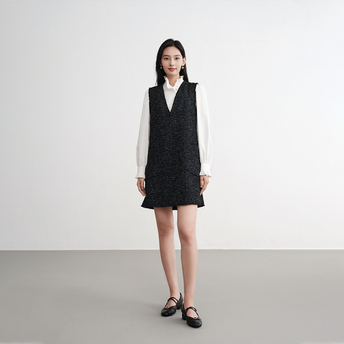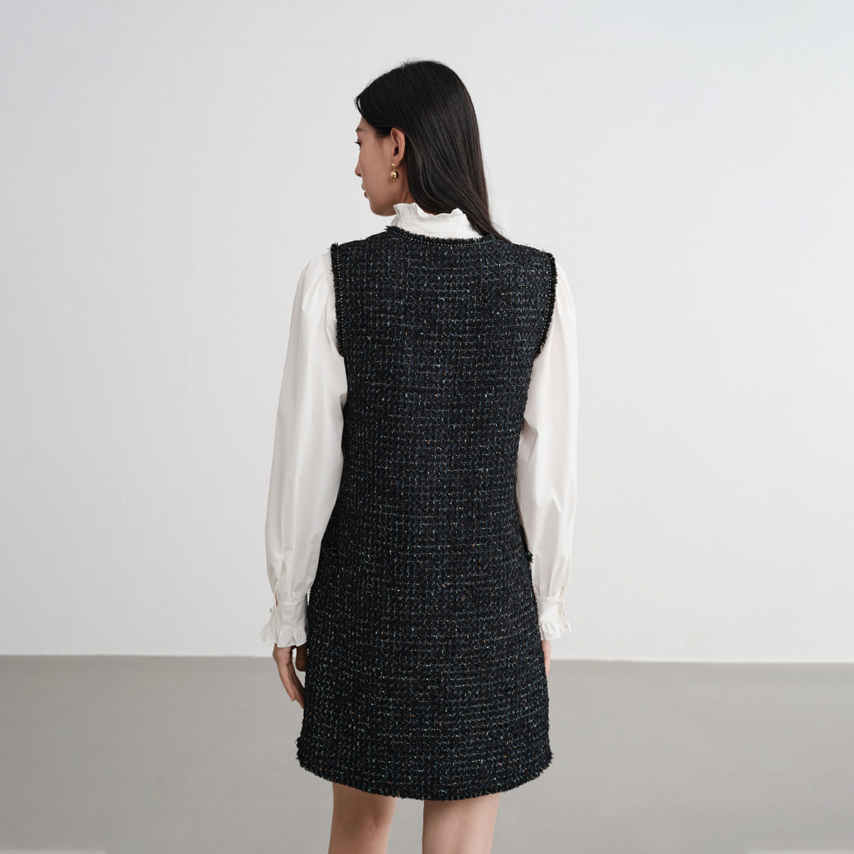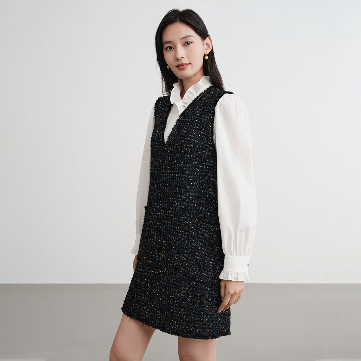 EP雅莹2025新款 优雅小香风V领显瘦含绵羊毛马甲连衣裙4111A 女装