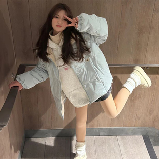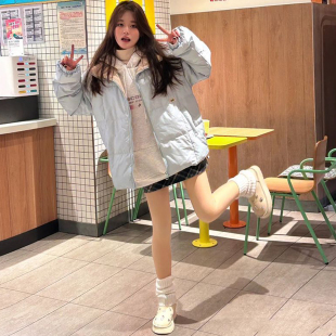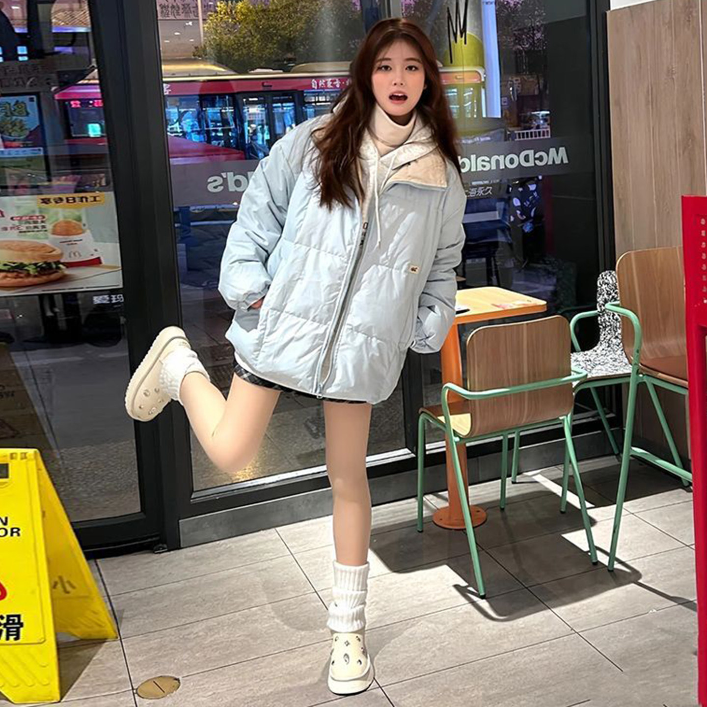 减龄百搭学生加厚保暖外套 蓝色简约慵懒风棉服女冬季 胖mm大码 女装