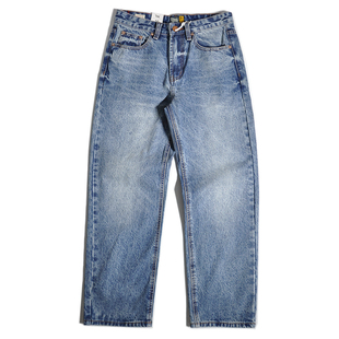 A字直筒阔腿裤 F383 男女款 复古丹宁原色绿松石弯刀牛仔裤 子潮 美式
