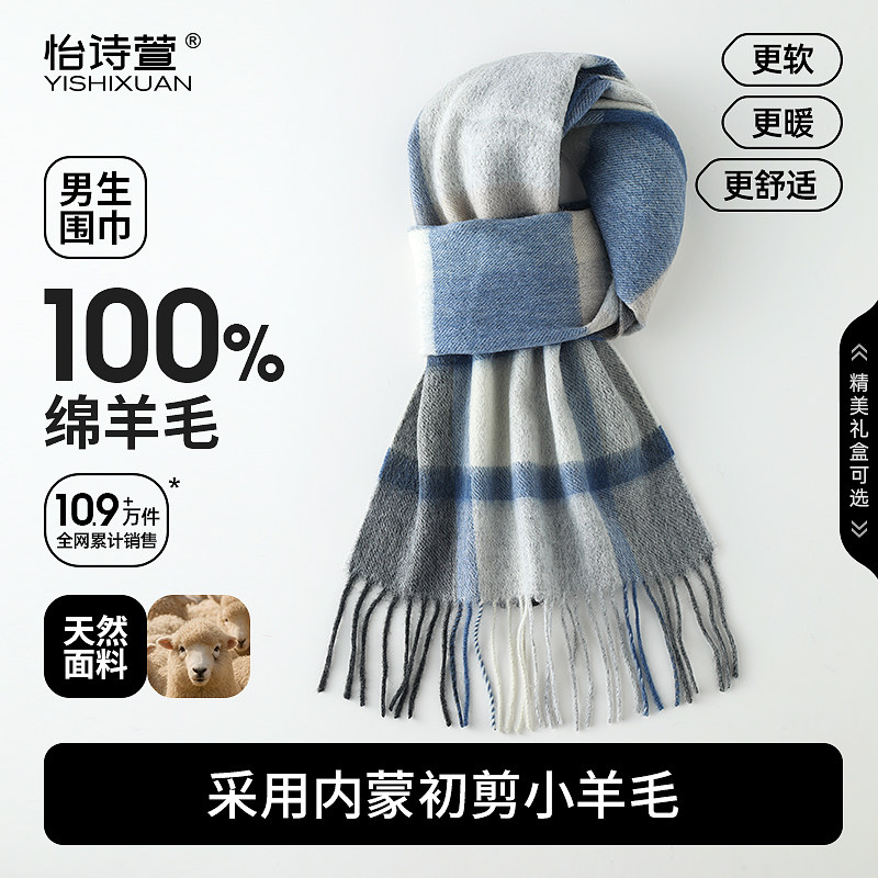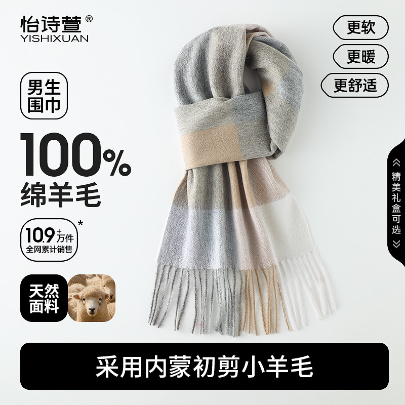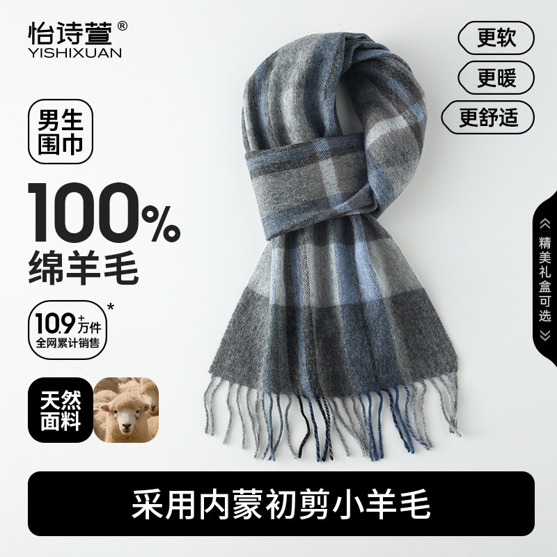 围脖大学生日送男友 高档礼盒男生2025新款 男士 围巾100%羊毛秋冬季