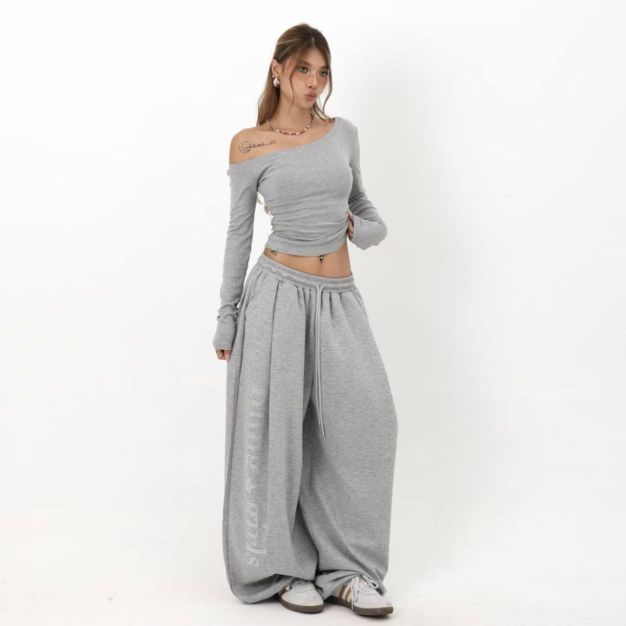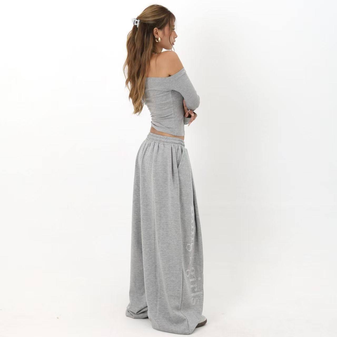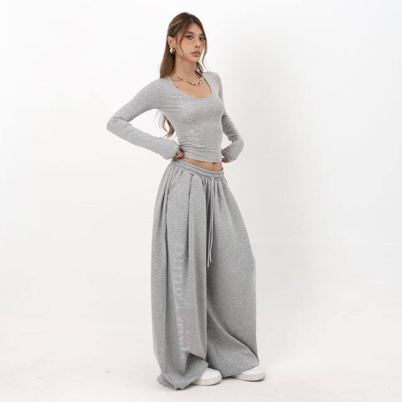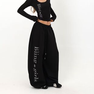 阔腿重工烫钻字母显瘦直筒运动卫裤 女秋季 潮 复古辣妹爵士舞裤 美式