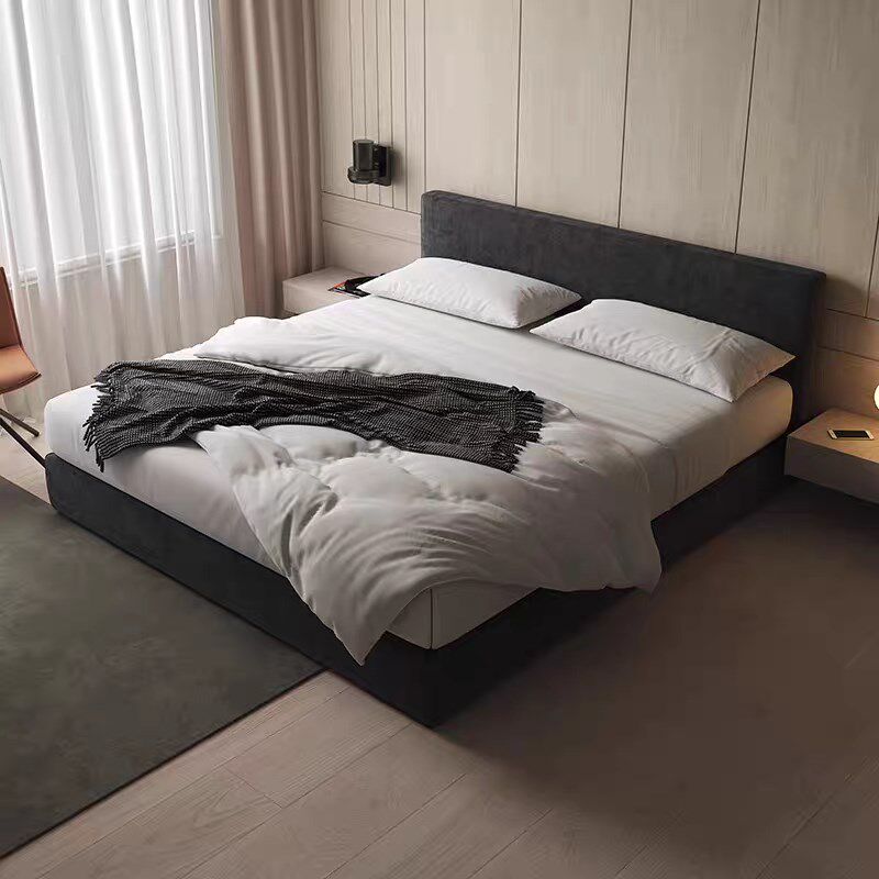 意式 极简黑d色婴儿绒布艺床现代主卧室双人床豆腐块榻榻米落地矮
