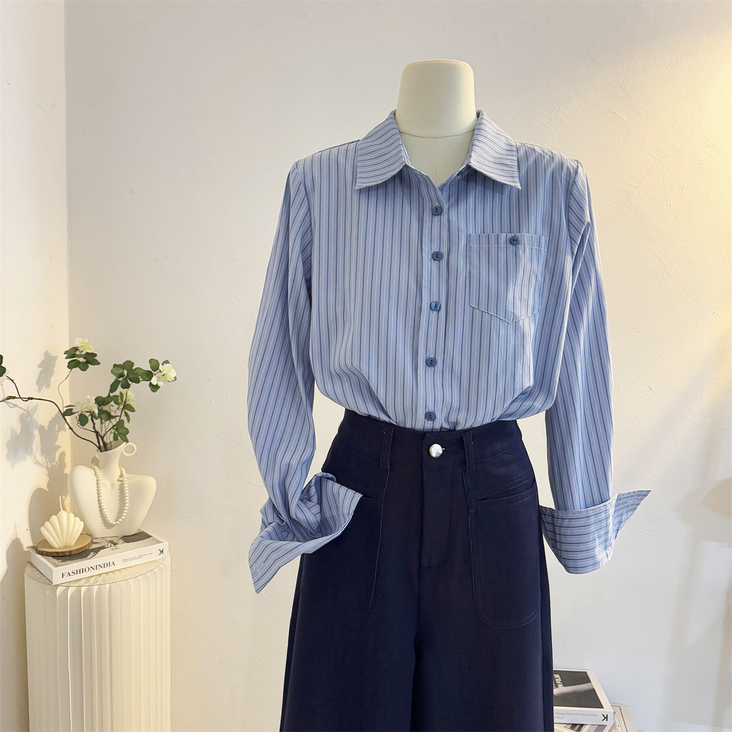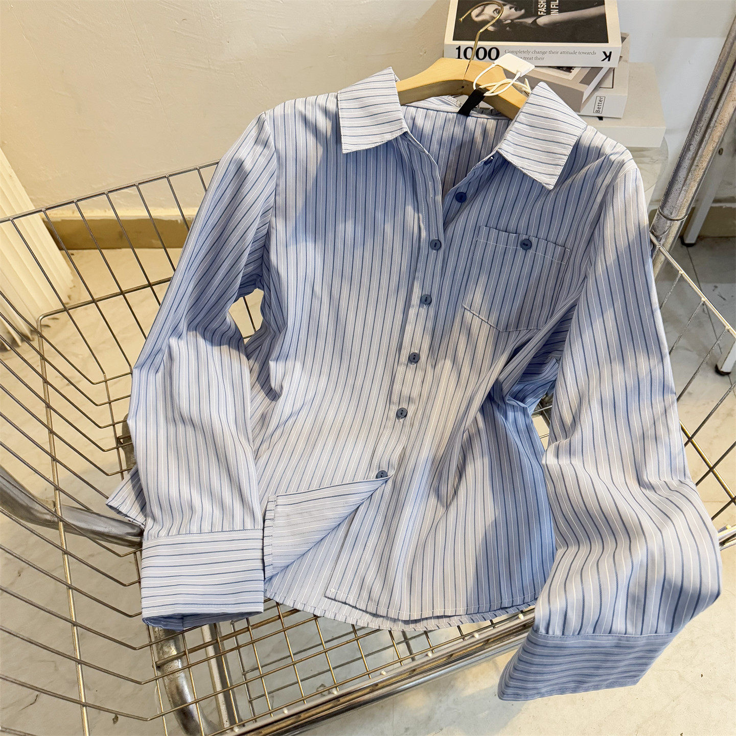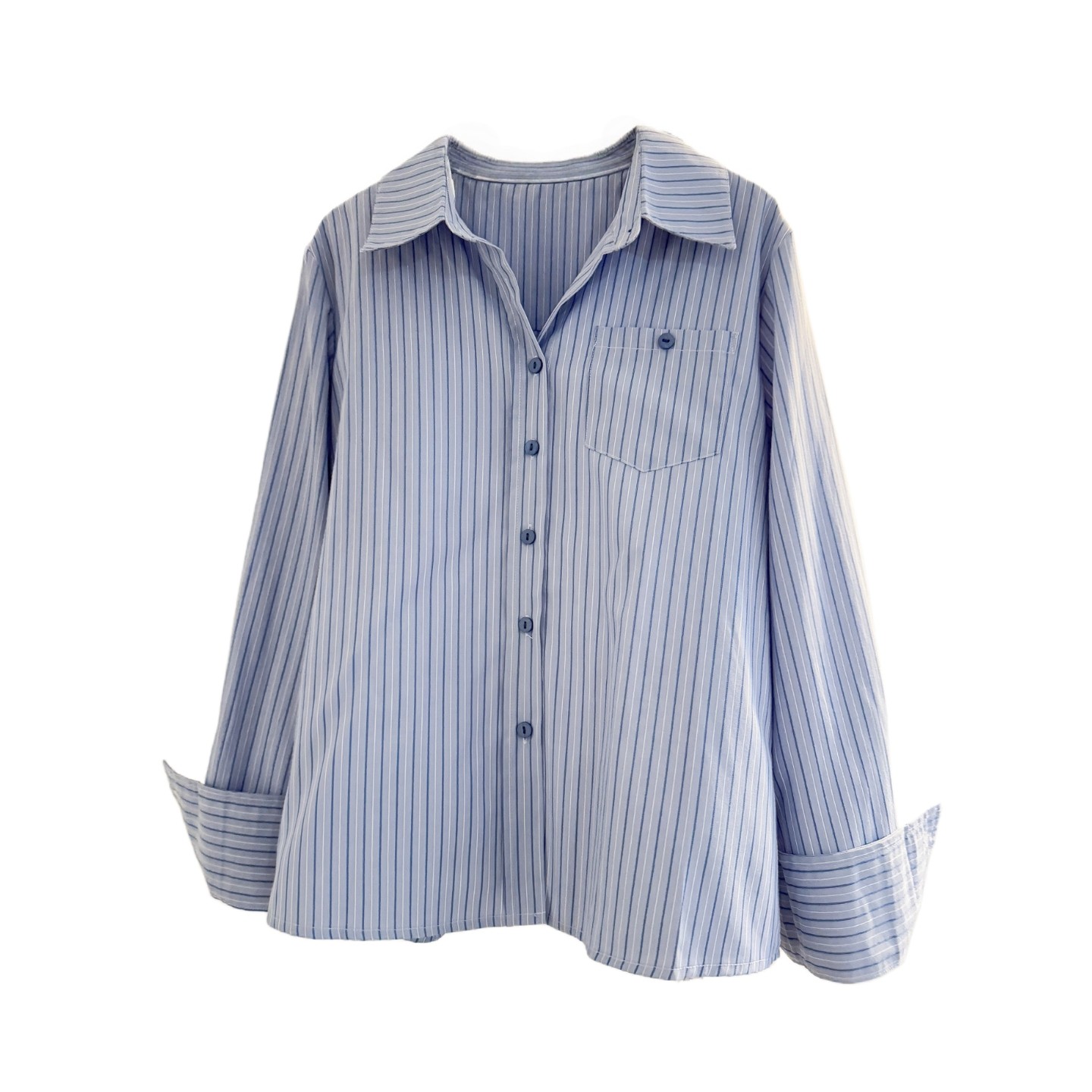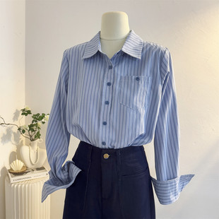蓝色条纹长袖 女2025秋宽松休闲气质职业通勤衬衣叠穿内搭上衣 衬衫