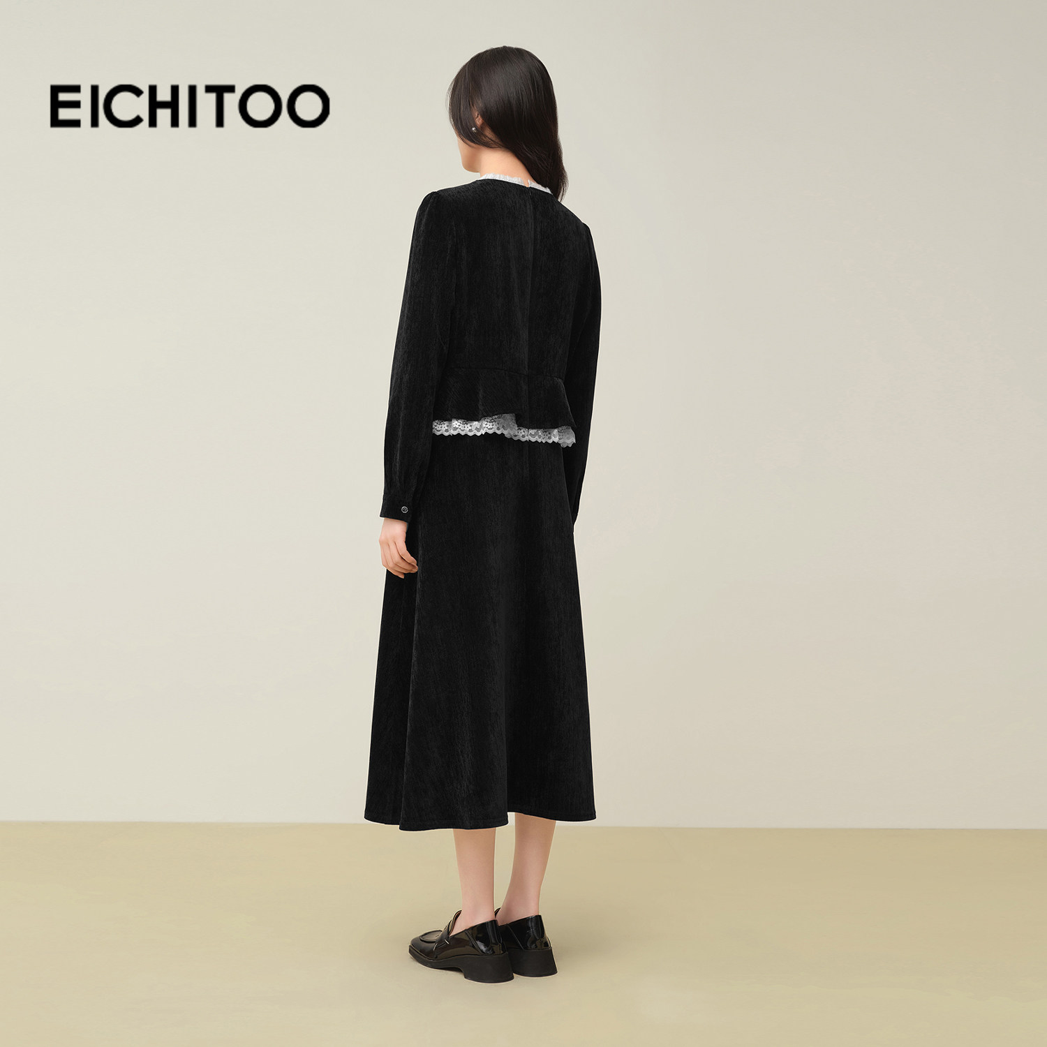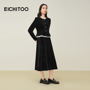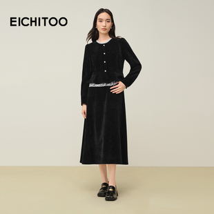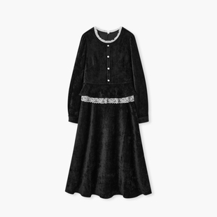 爱居兔假两件设计感蕾丝边连衣裙女2025年冬季 气质通勤小黑裙 新款