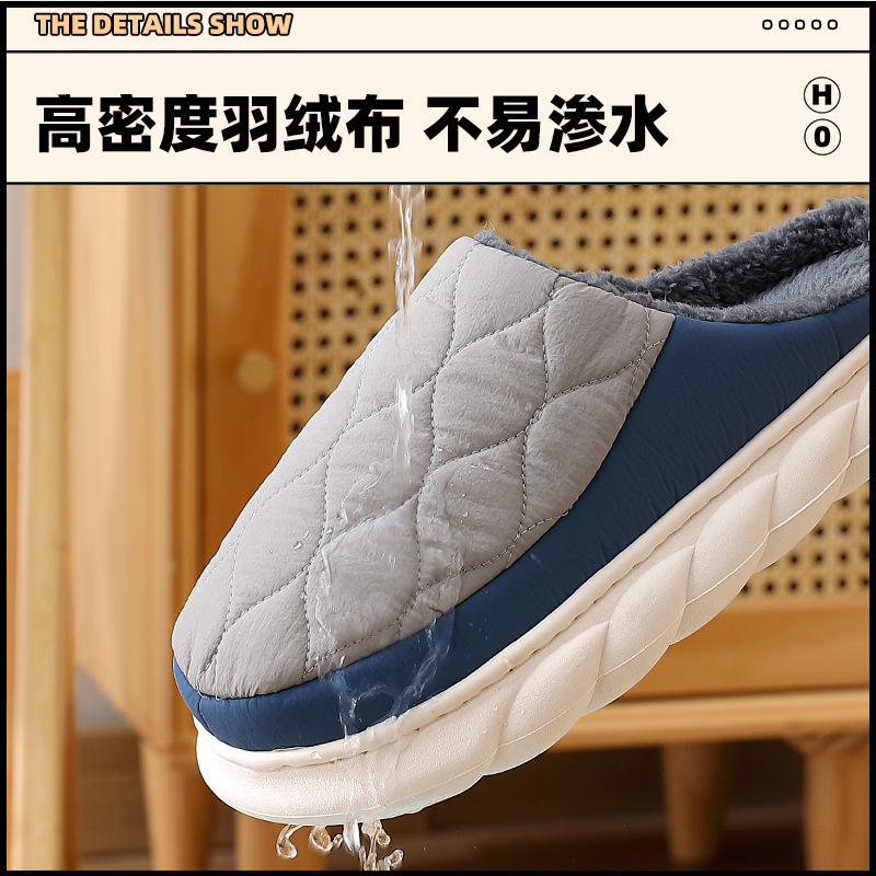 冬季 羽绒棉拖鞋 家居厚底毛拖鞋 防滑保暖居家防水棉拖女款 男士