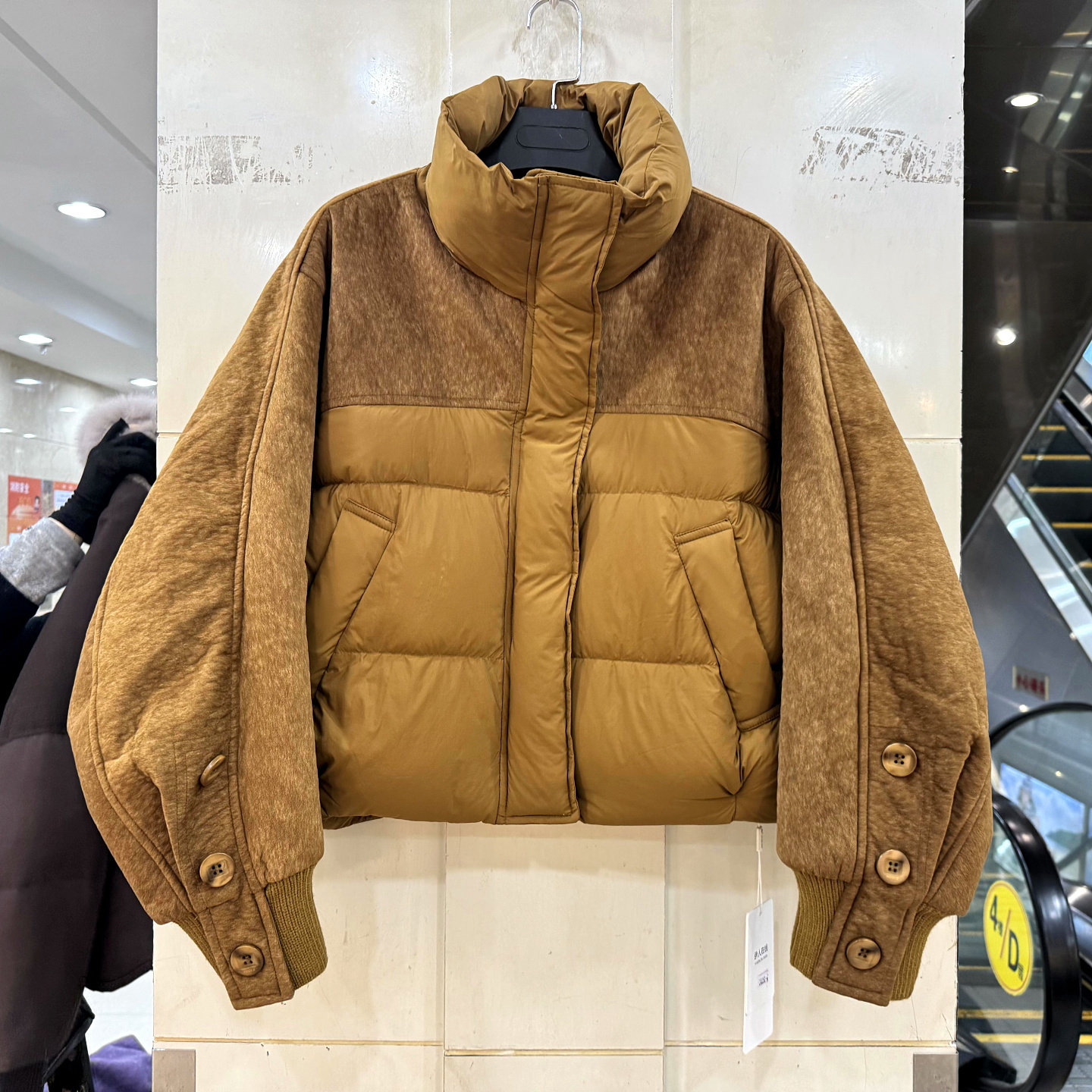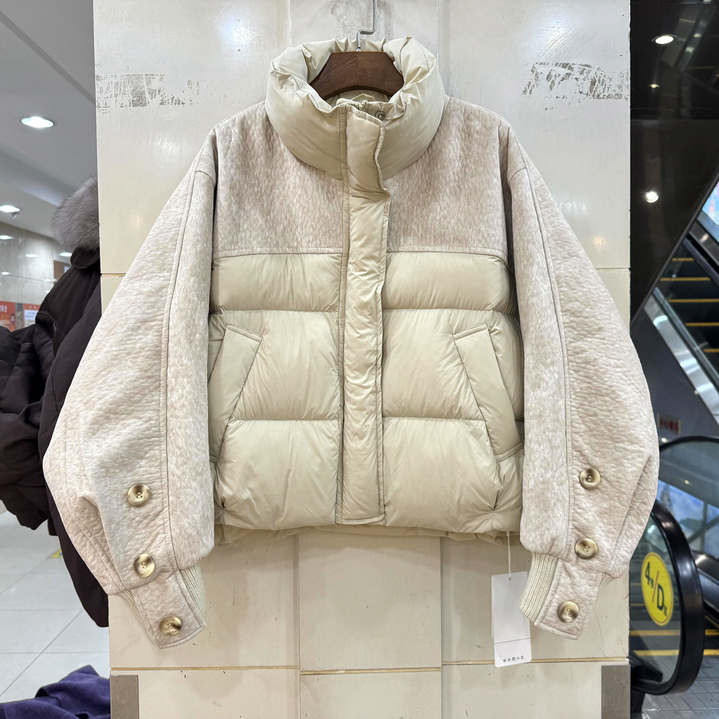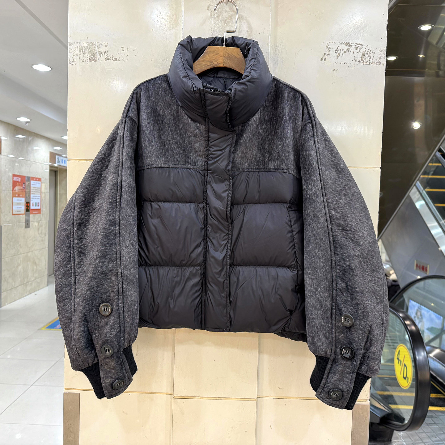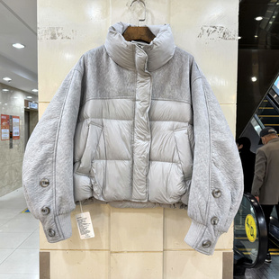 38851 羽绒服欧货冬装 订纽扣拼皮泡泡袖 加厚短装 立领休闲阔版