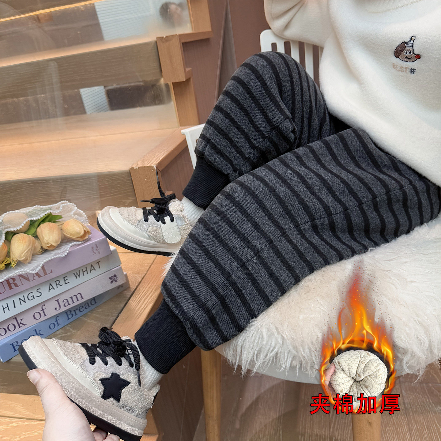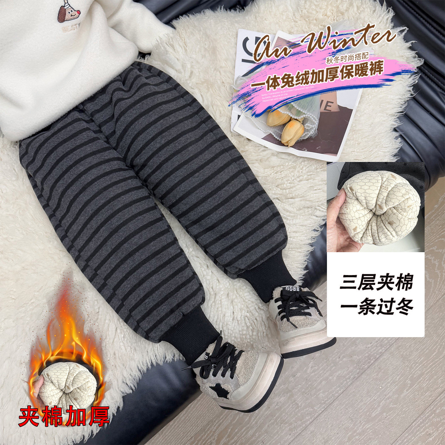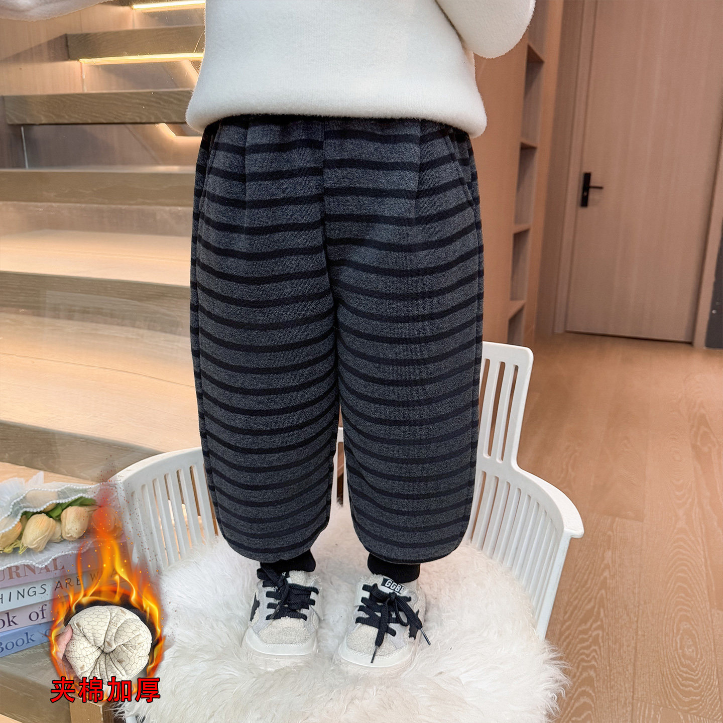子冬季 一条过冬裤 加厚女宝宝条纹棉裤 儿童冬装 2025新款 女童夹棉裤