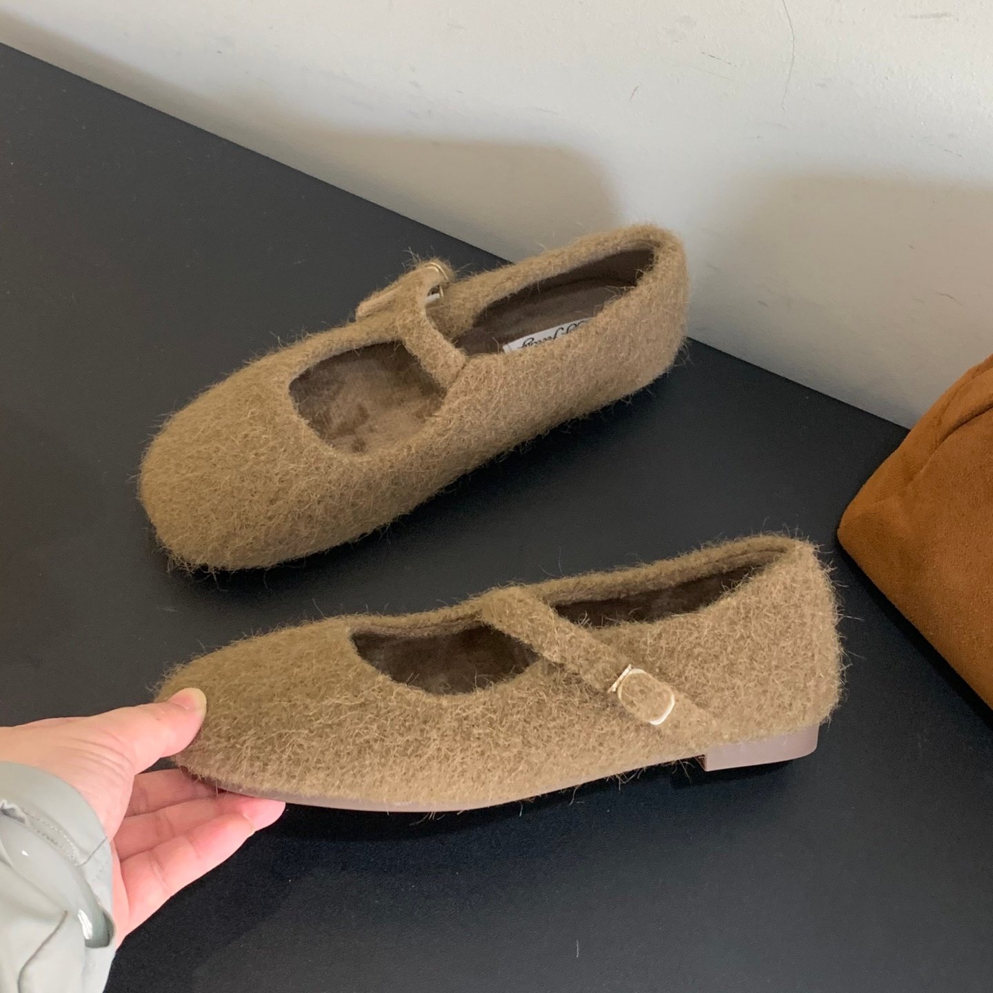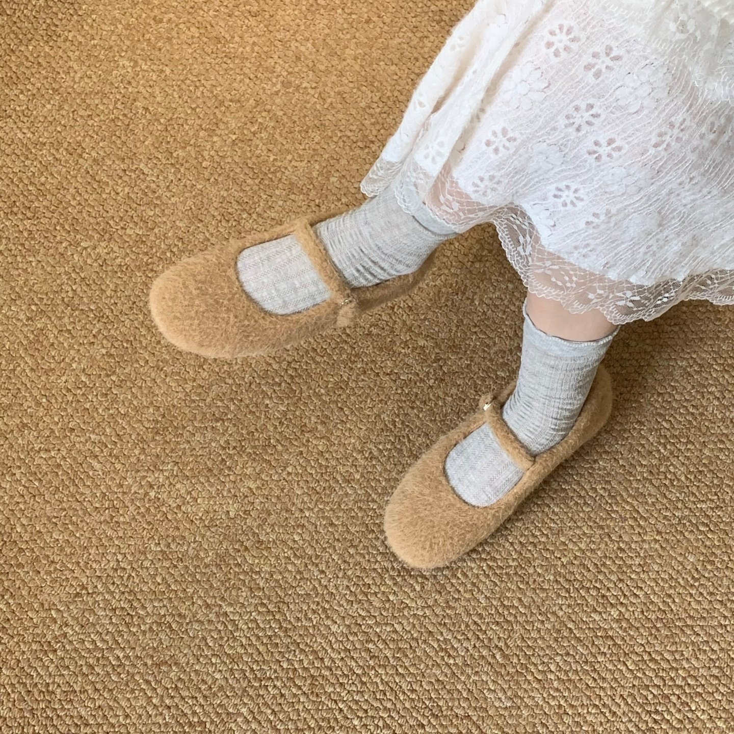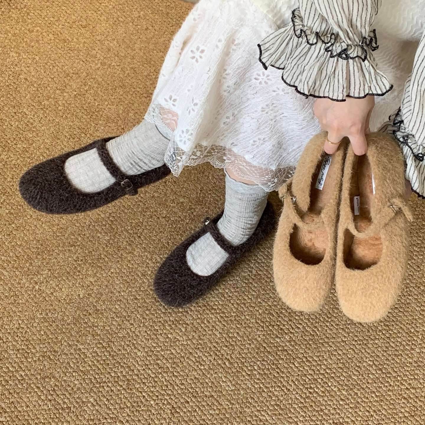 毛毛鞋 浅口平底温柔复古舒适奶奶鞋 秋冬新款 毛呢蝴蝶结加绒单鞋