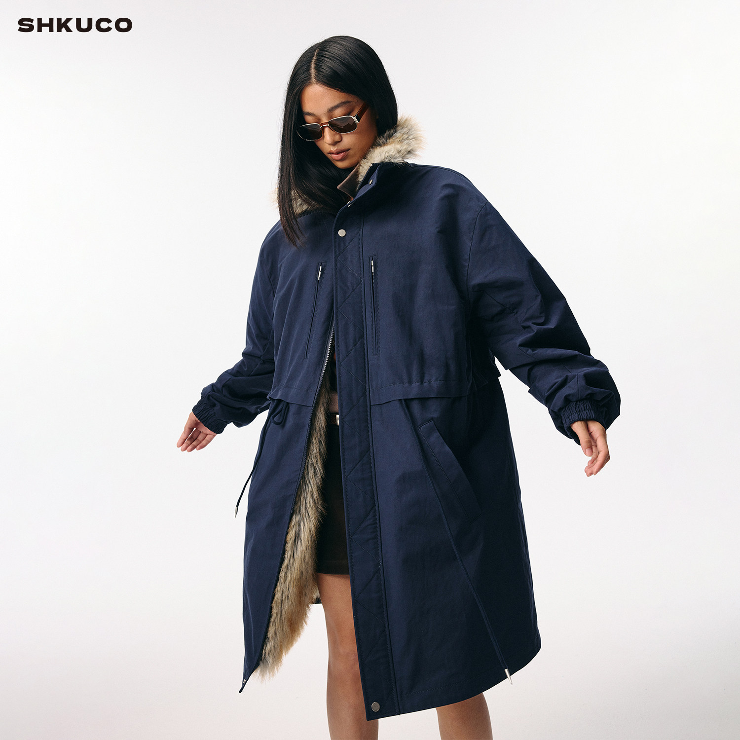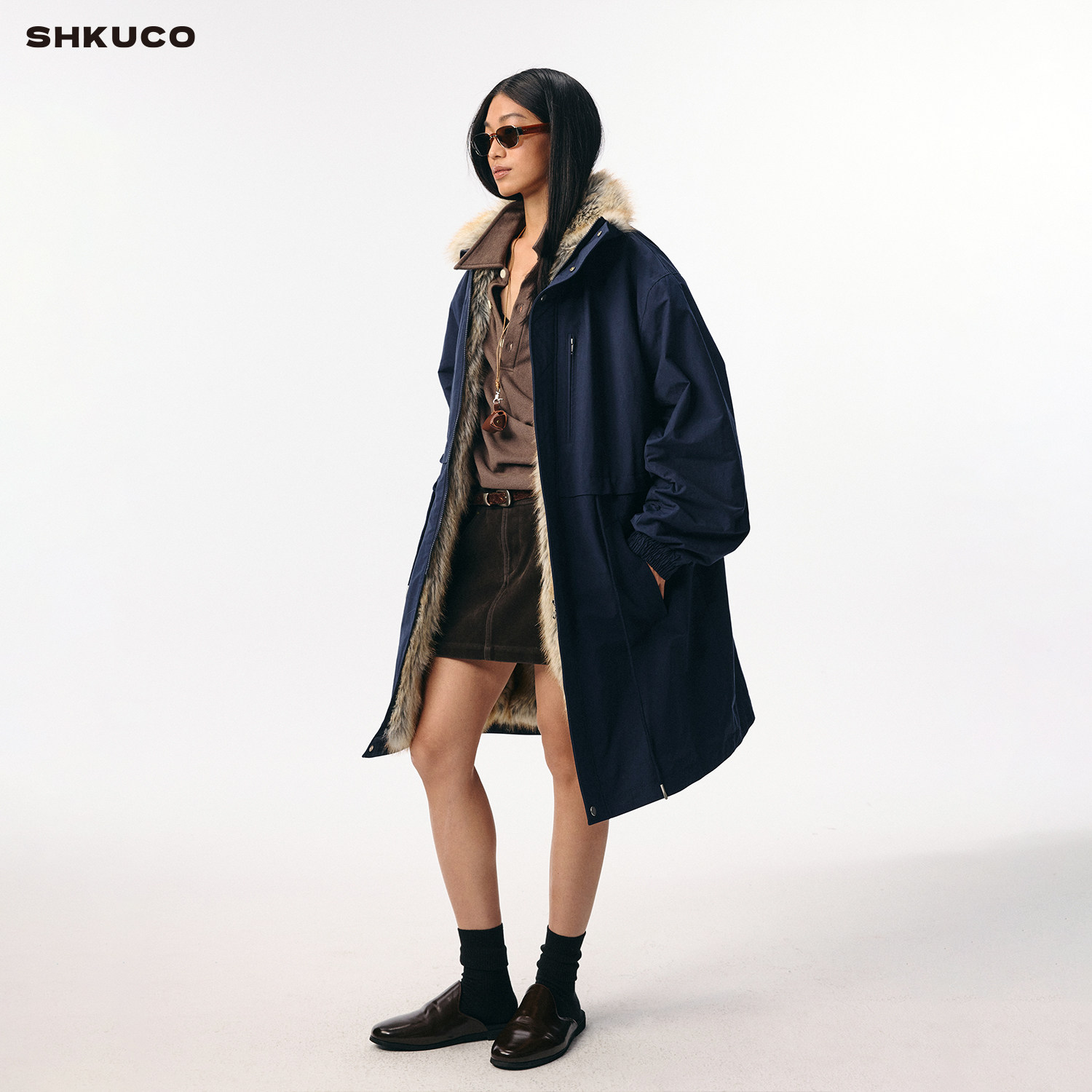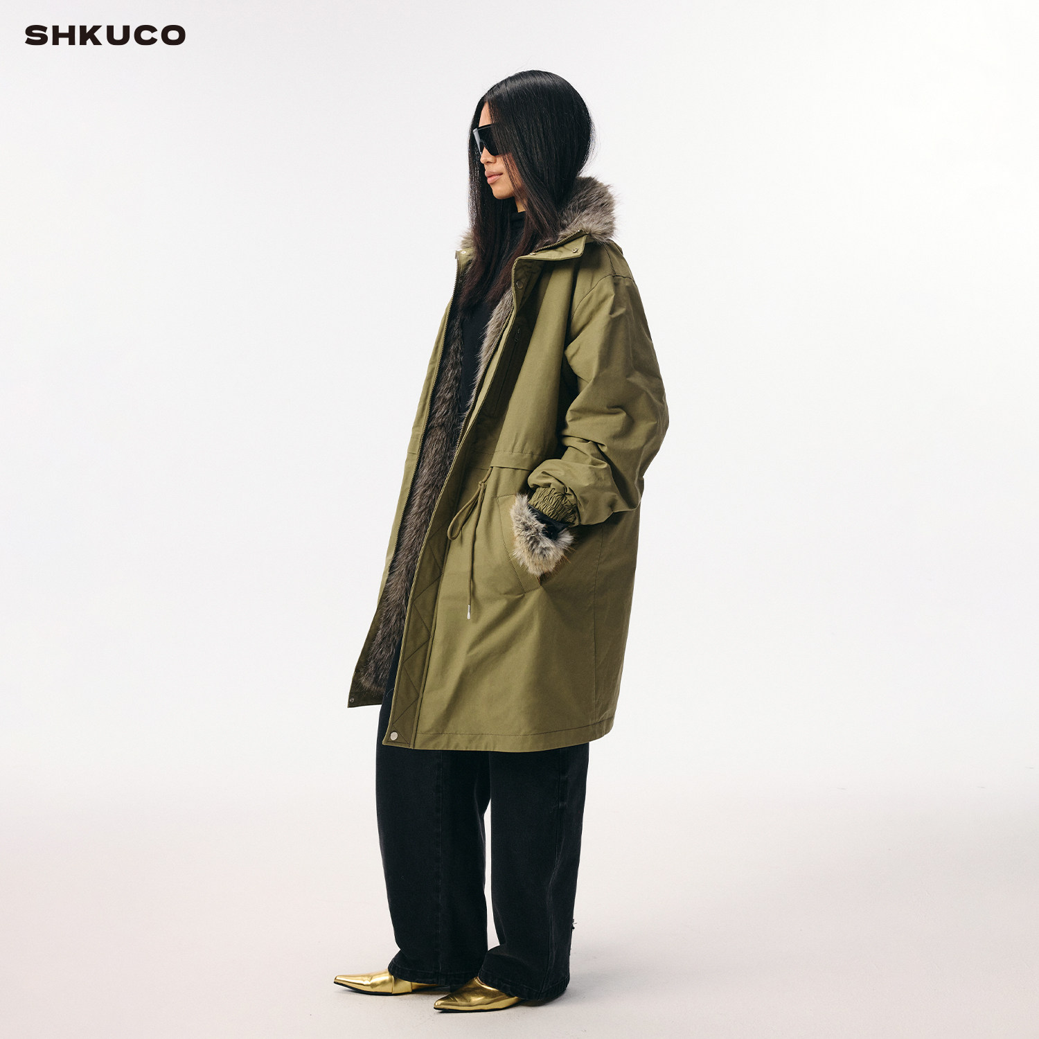 SHKUCO 抗风秋冬皮草派克服大衣 环保狐狸毛毛领加厚中长款