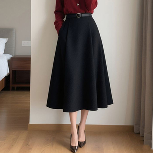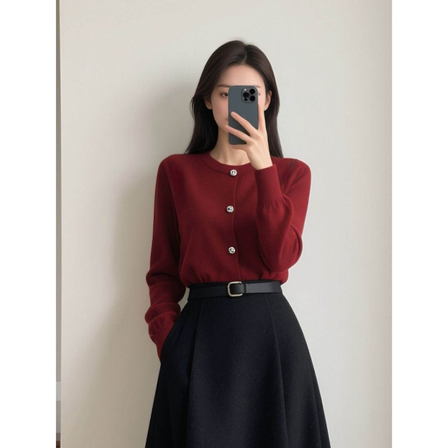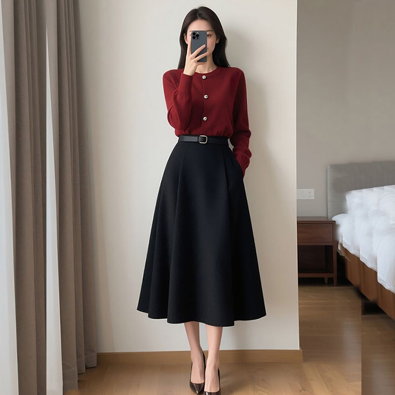 秋冬复古套裙酒红色针织上衣女轻奢优雅风口袋毛呢半身裙两件套装