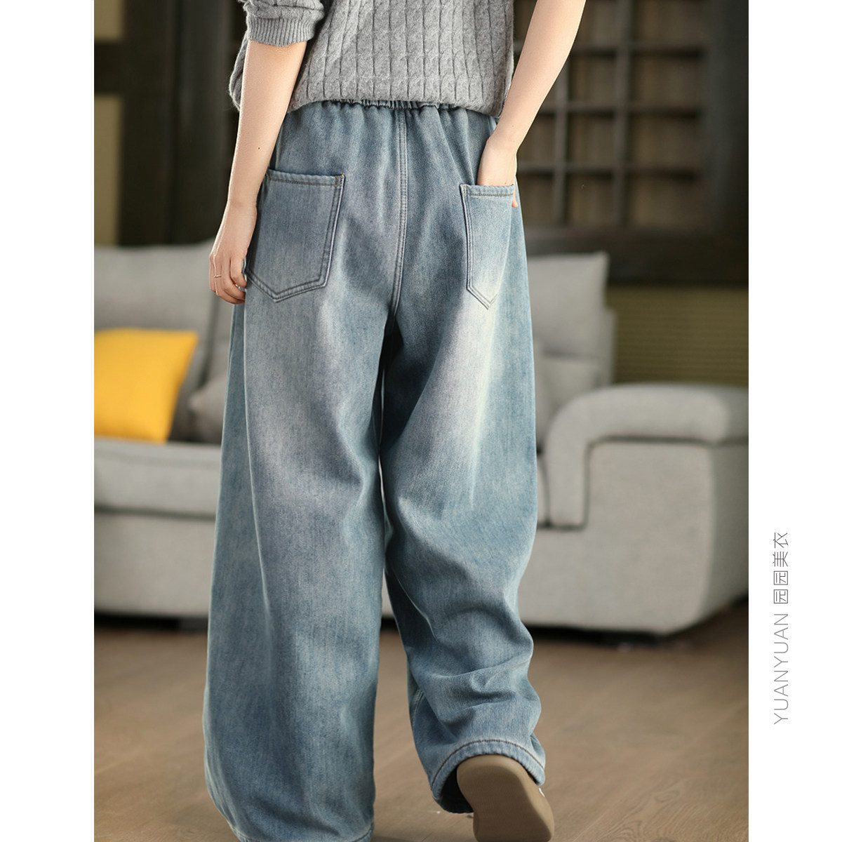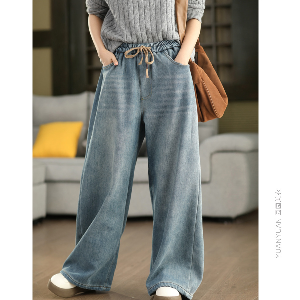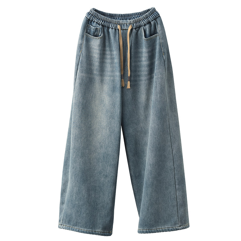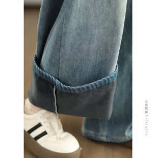 保暖文艺长裤 女高腰加厚直筒裤 复古牛仔加绒阔腿裤 3.25美衣冬季