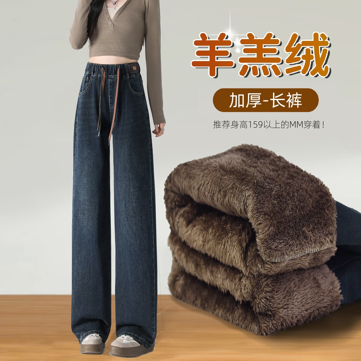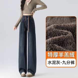 加绒加厚裤 直筒冬季 子 女士胖mm梨形身材大码 特厚羊羔绒阔腿牛仔裤