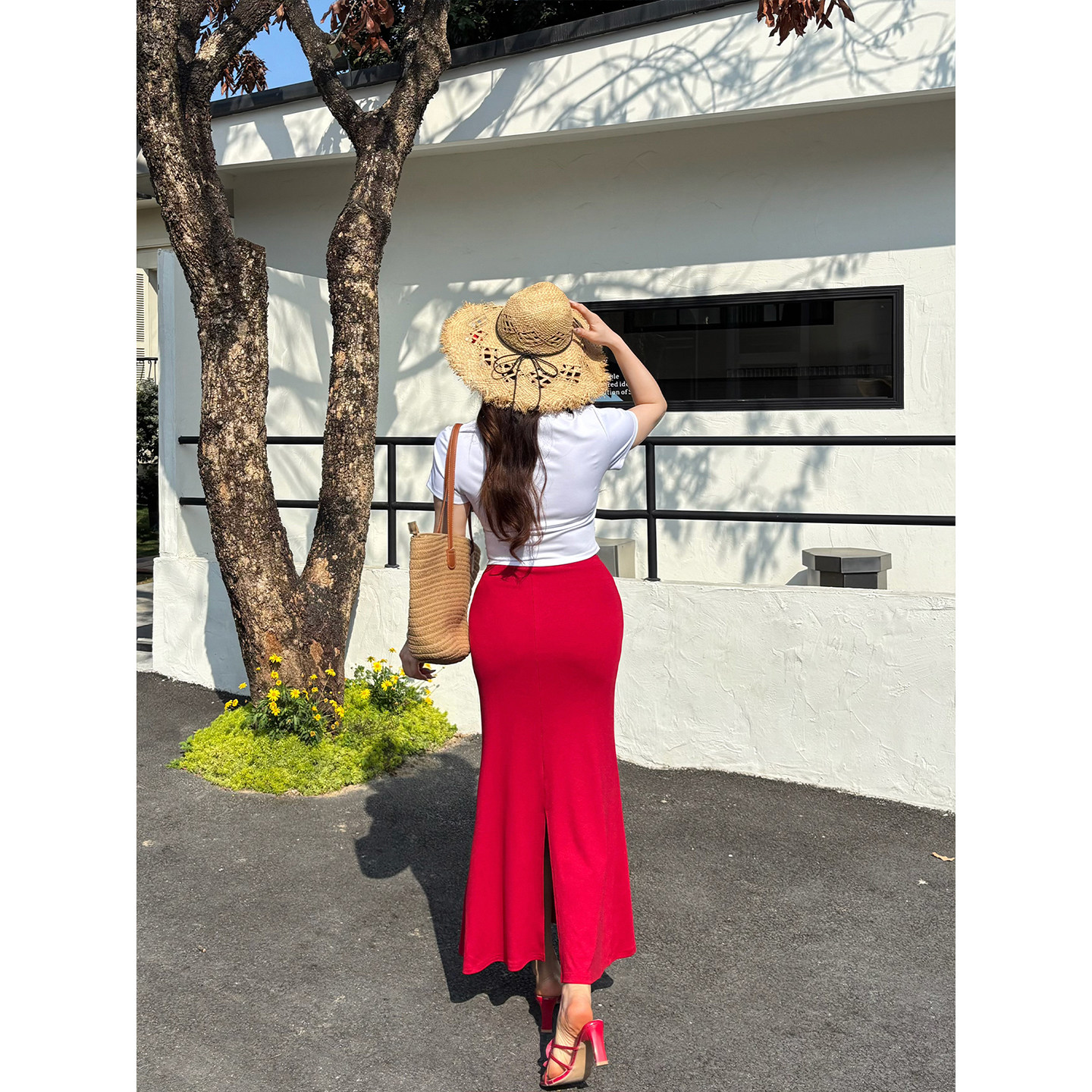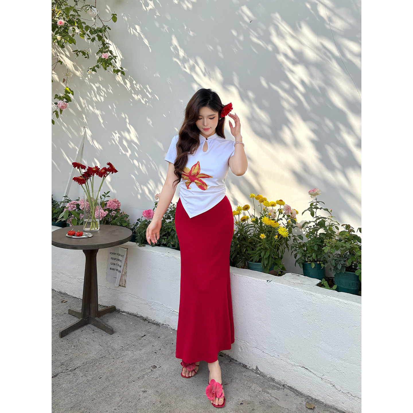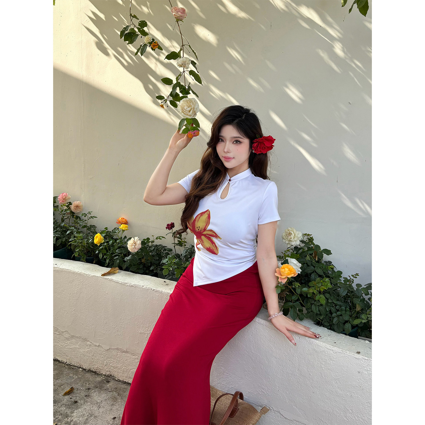 babes 印花立领盘扣修身 南国朱槿 新中式 包臀鱼尾裙 春夏大码