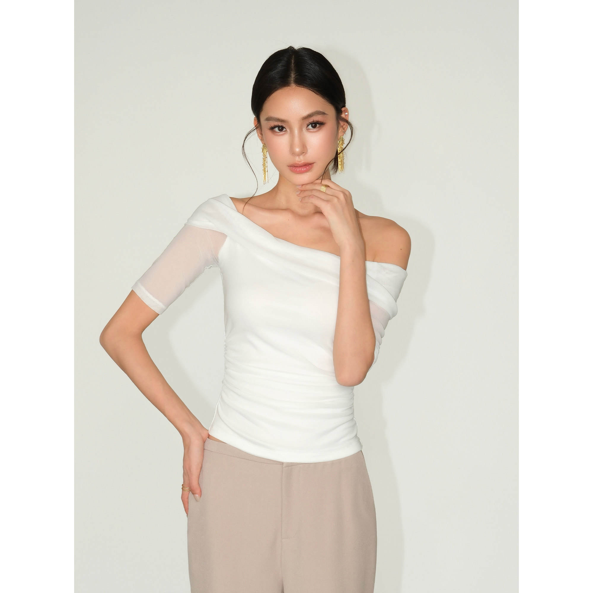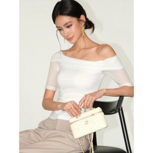 收腰短袖 NEVA 一字肩网纱拼接露肩上衣女气质修身 时髦猎手 T恤