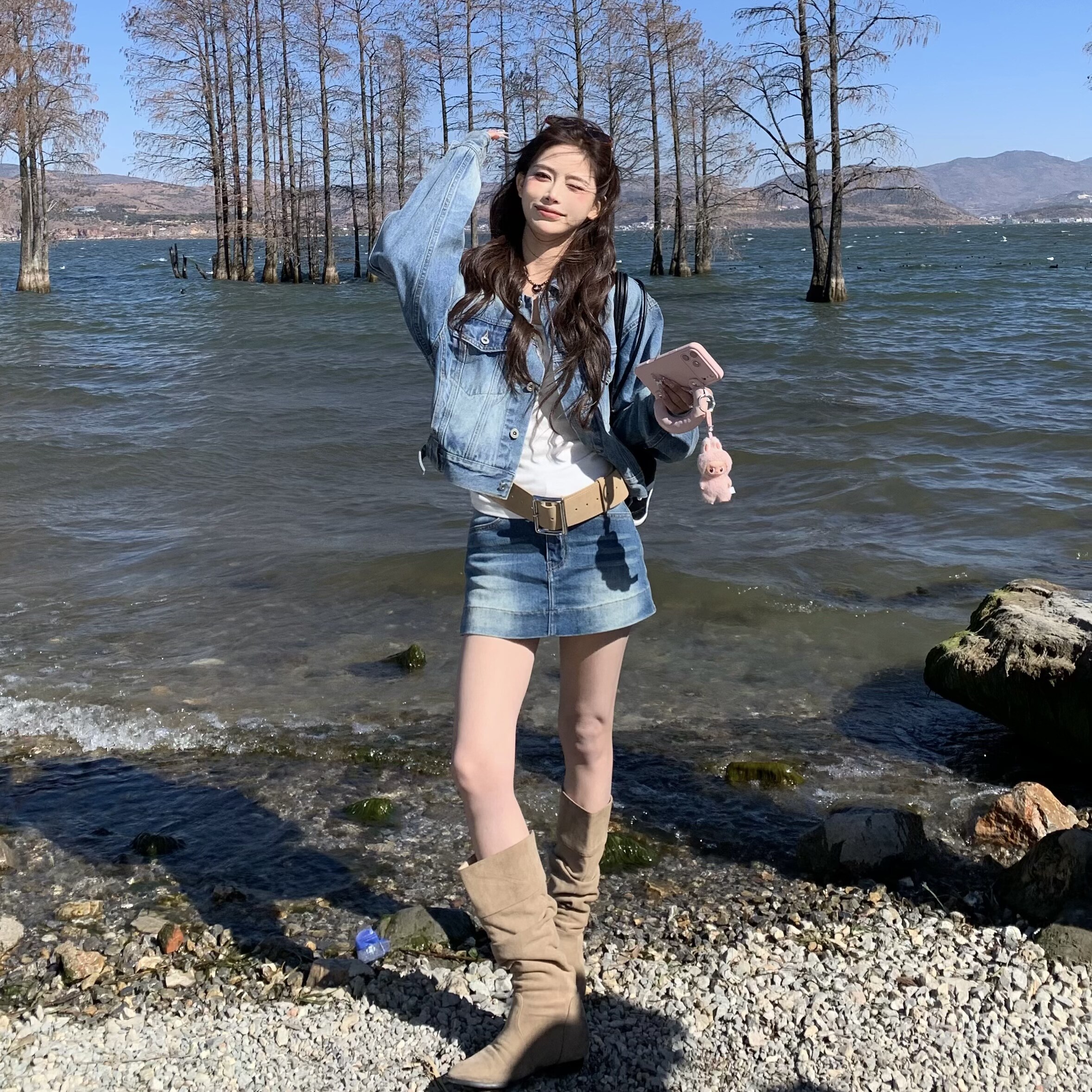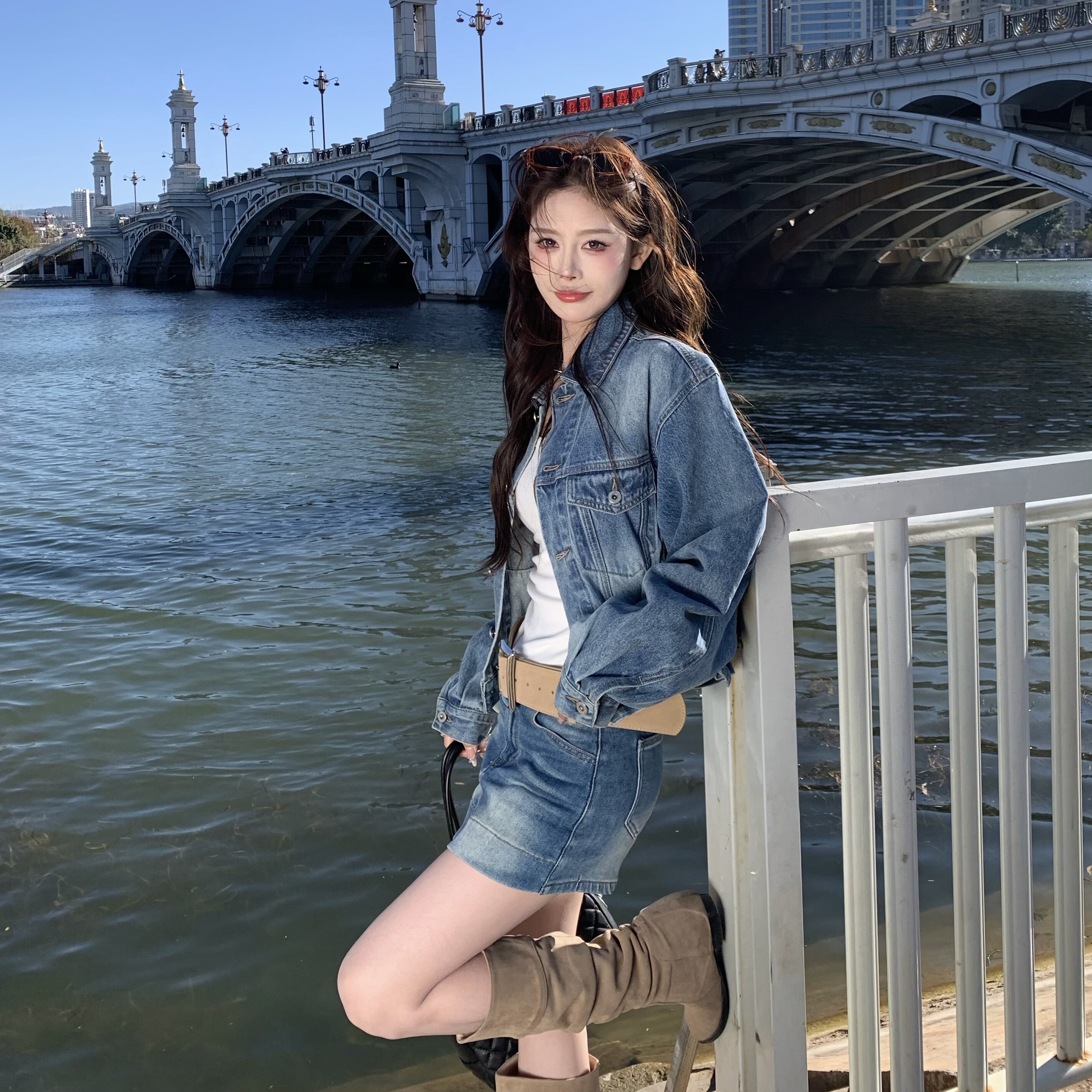 新款 女春季 两件套 套装 3MER哦哦三妹韩系减龄蓝色牛仔外套半身裙裤