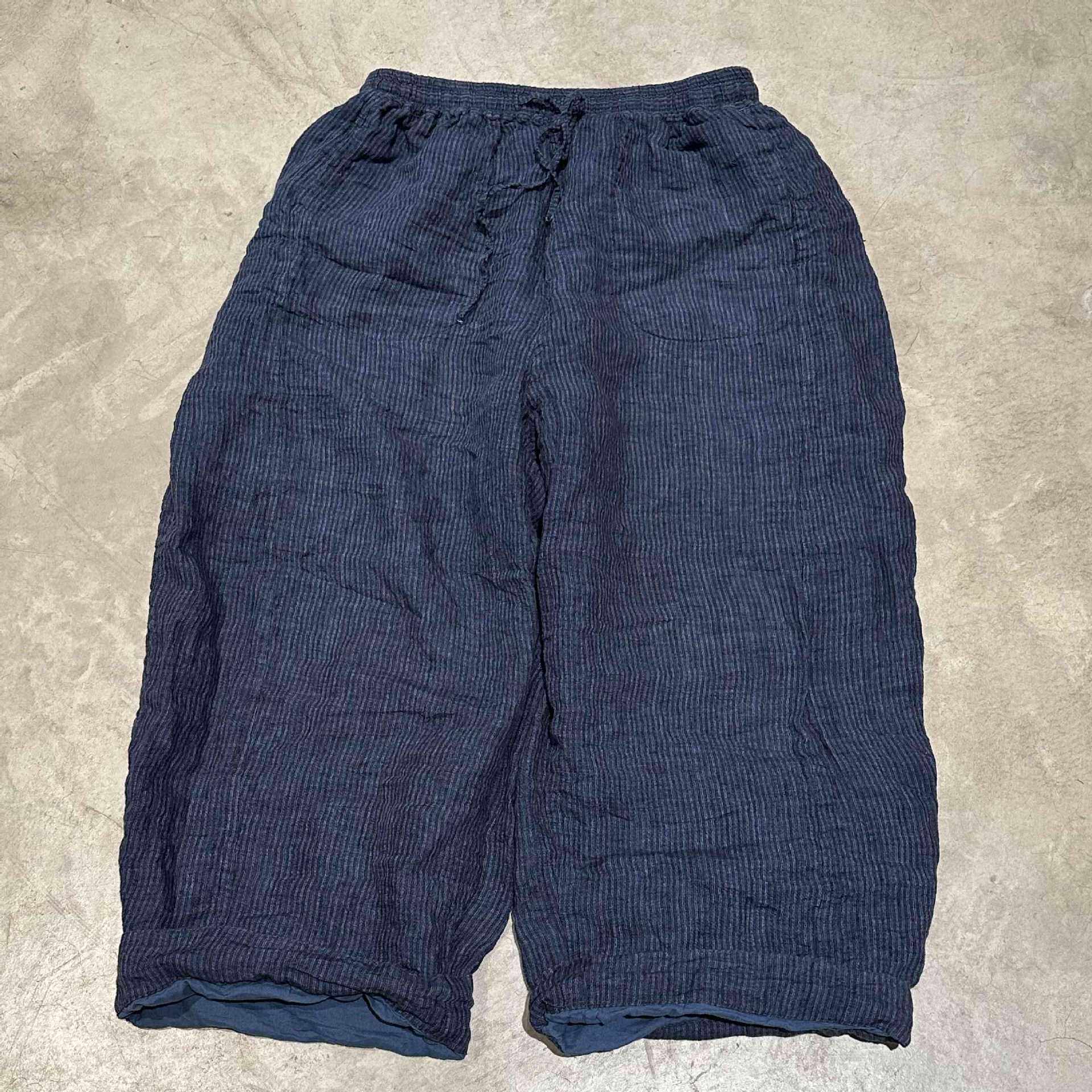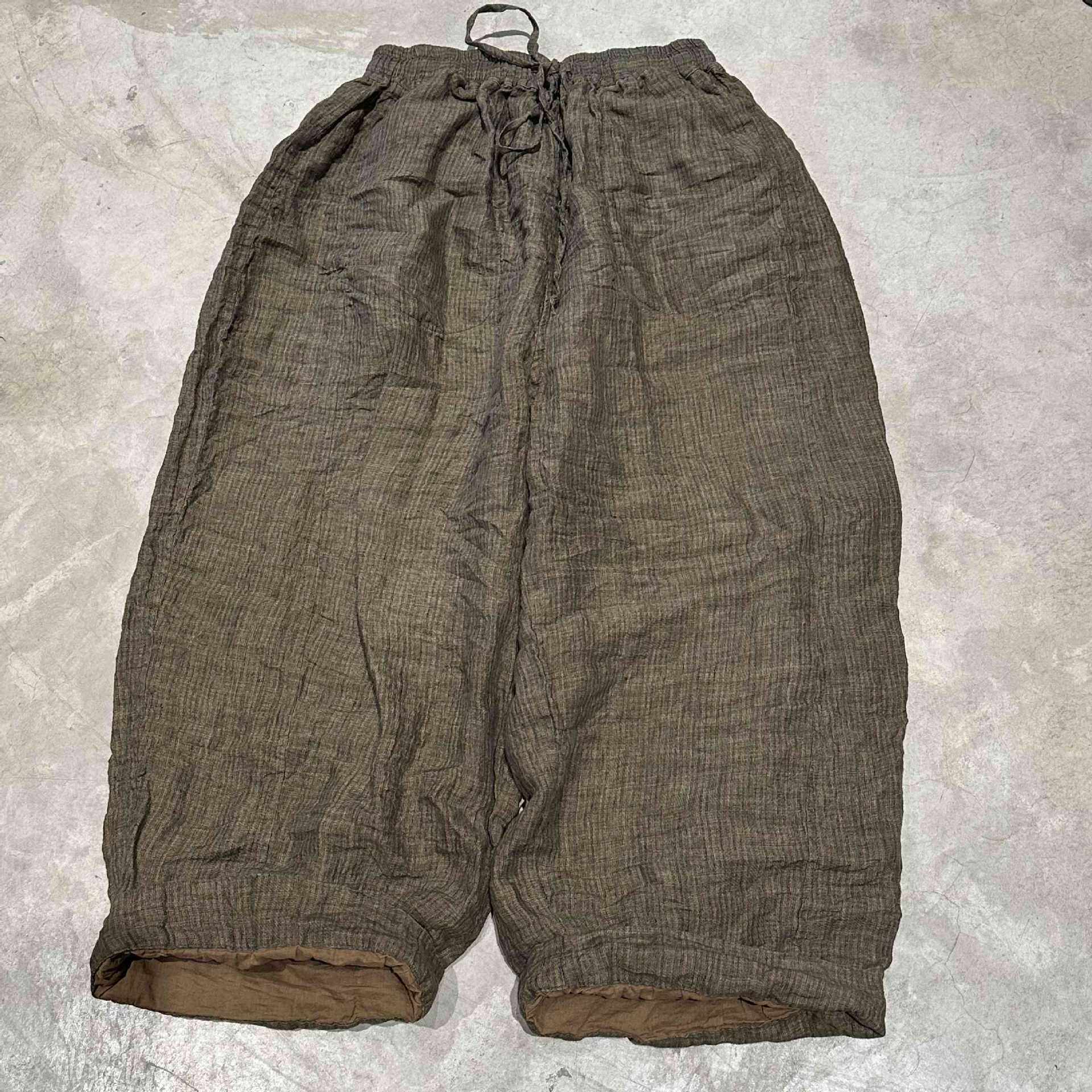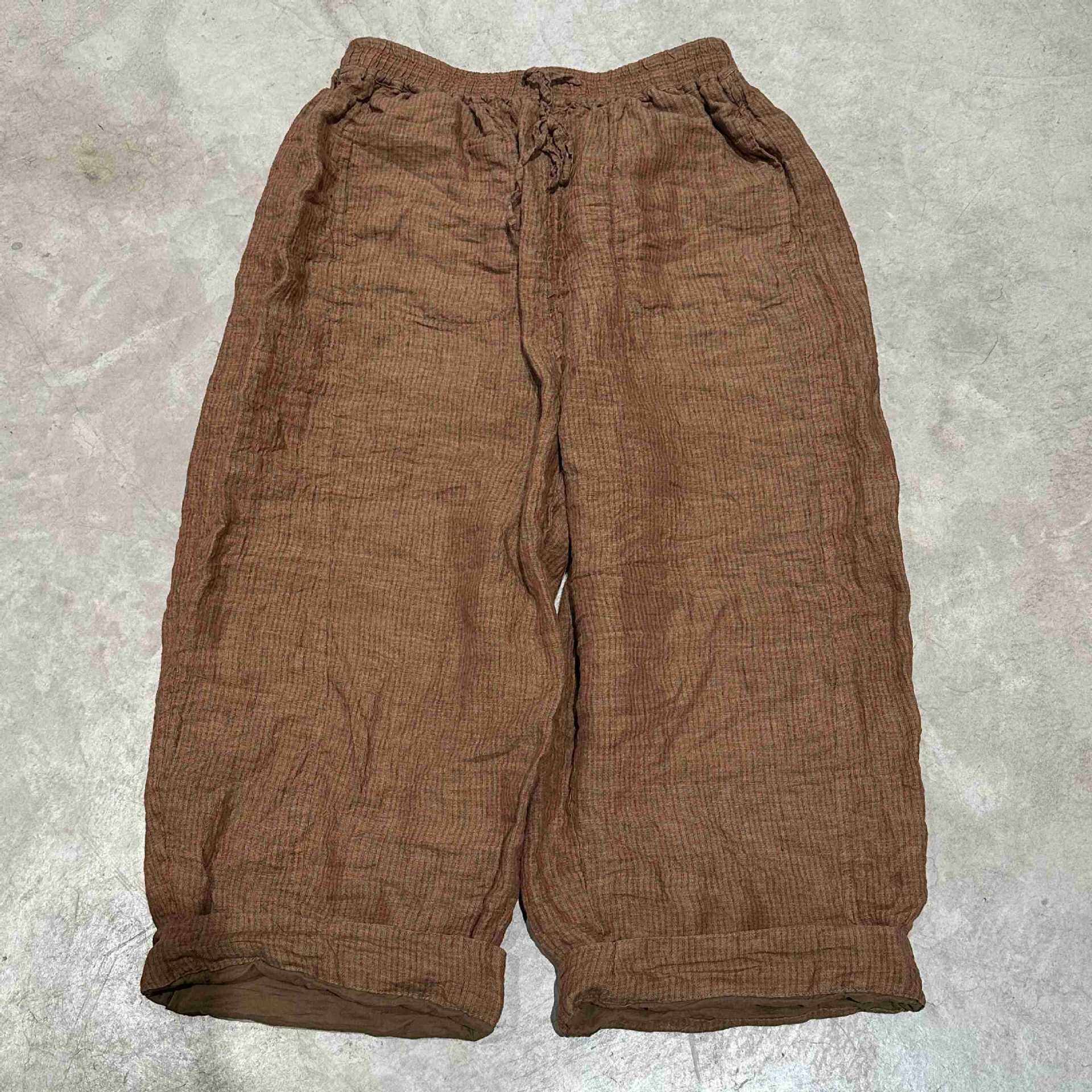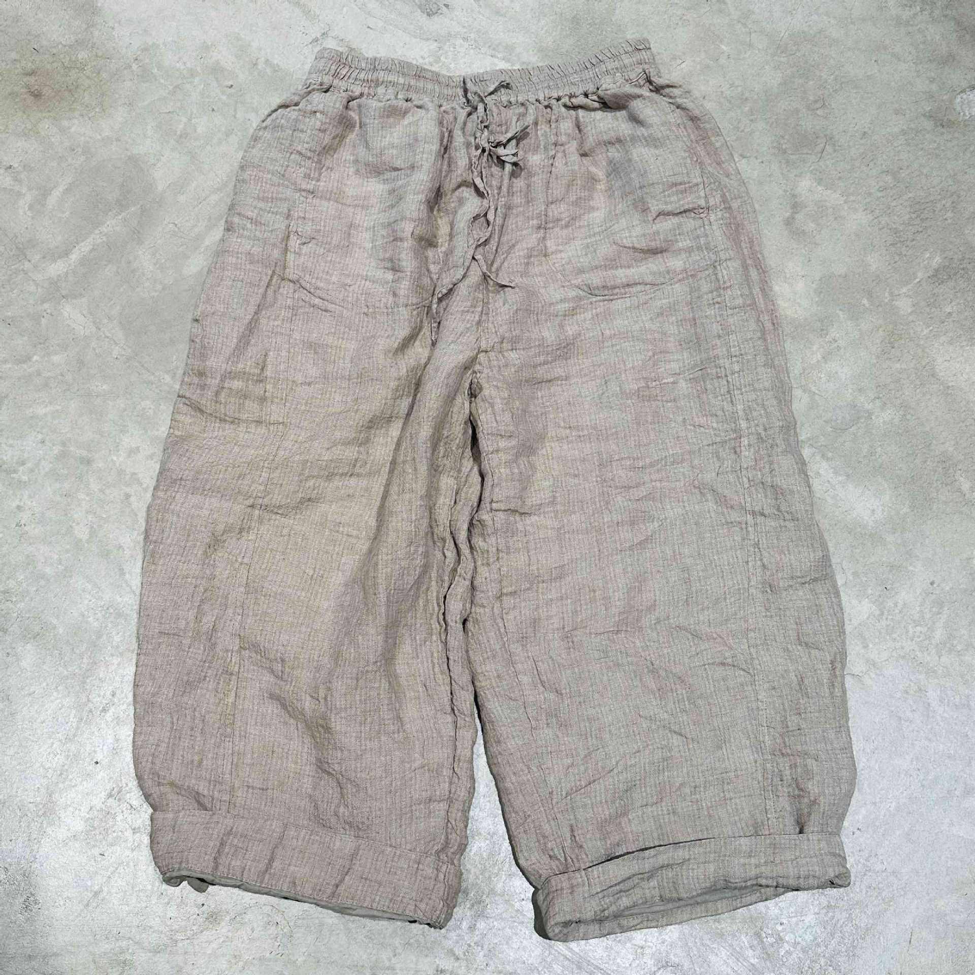 素年未央原创设计SN286色织亚麻条纹松紧腰双层宽松系带休闲长裤
