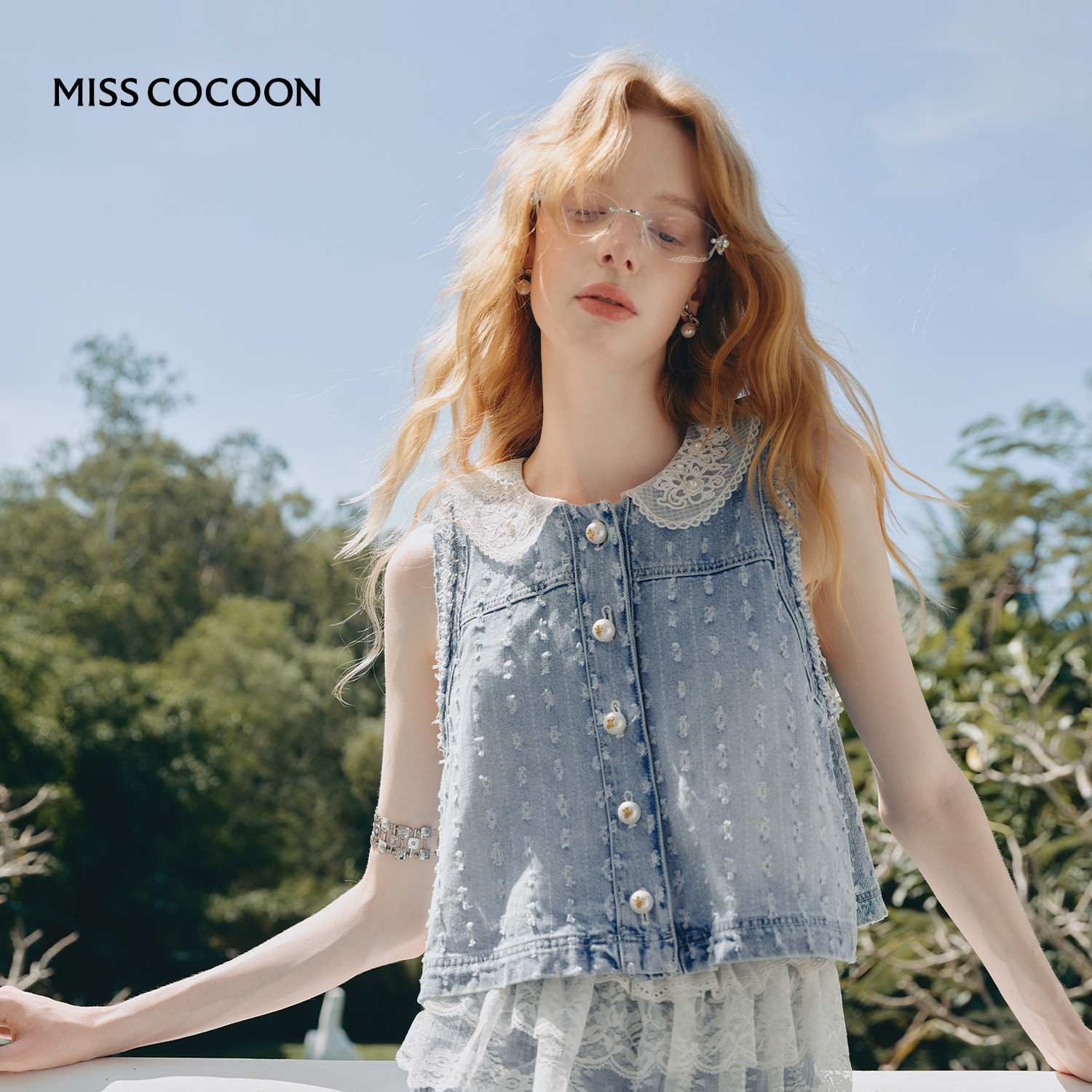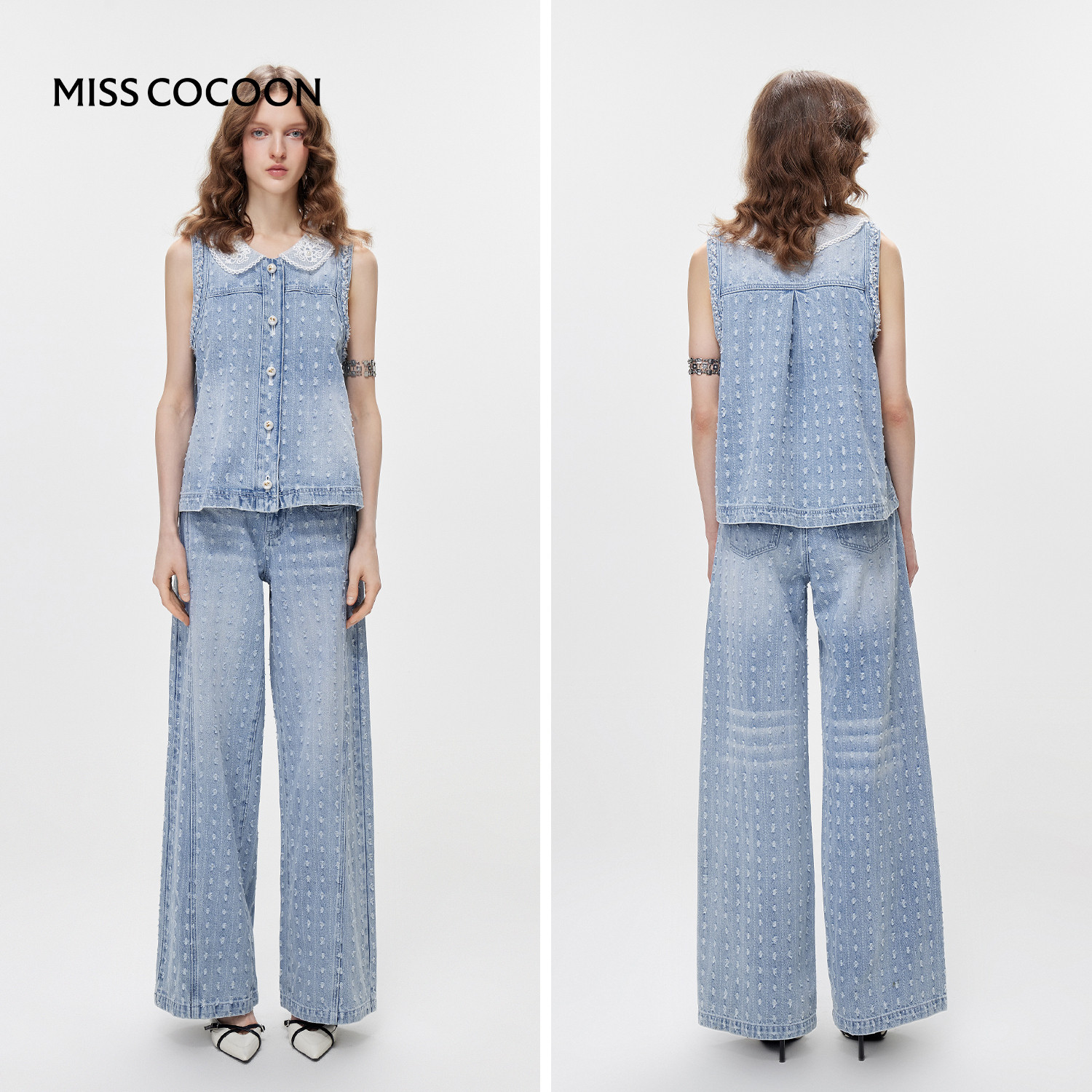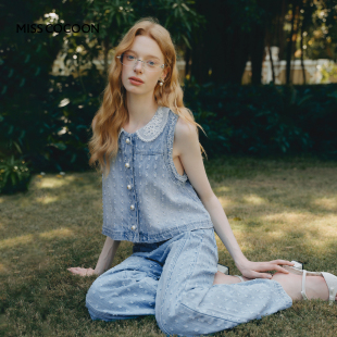 100%棉牛仔套装 MISSCOCOON可可尼蕾丝娃娃领马甲女2026春季 新款