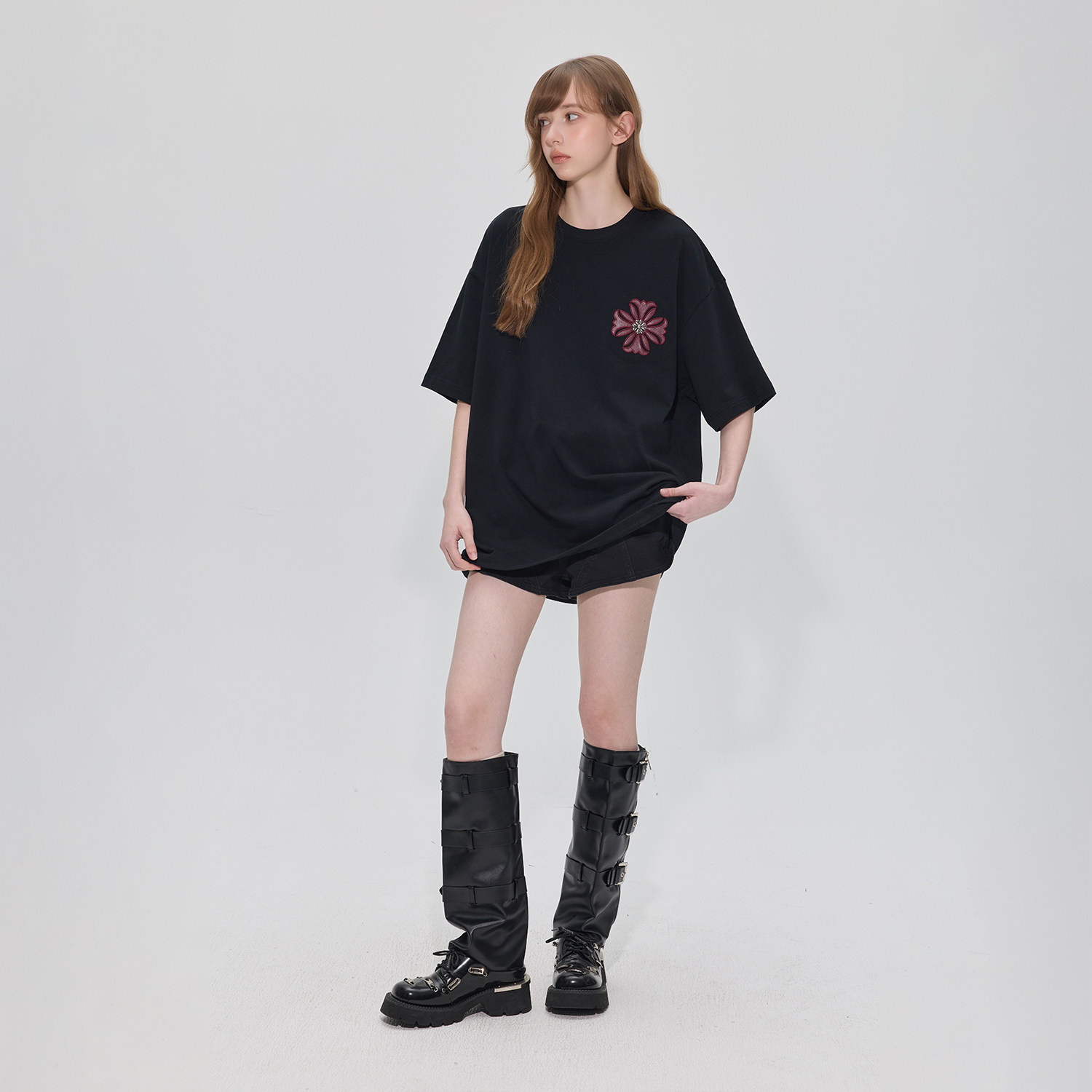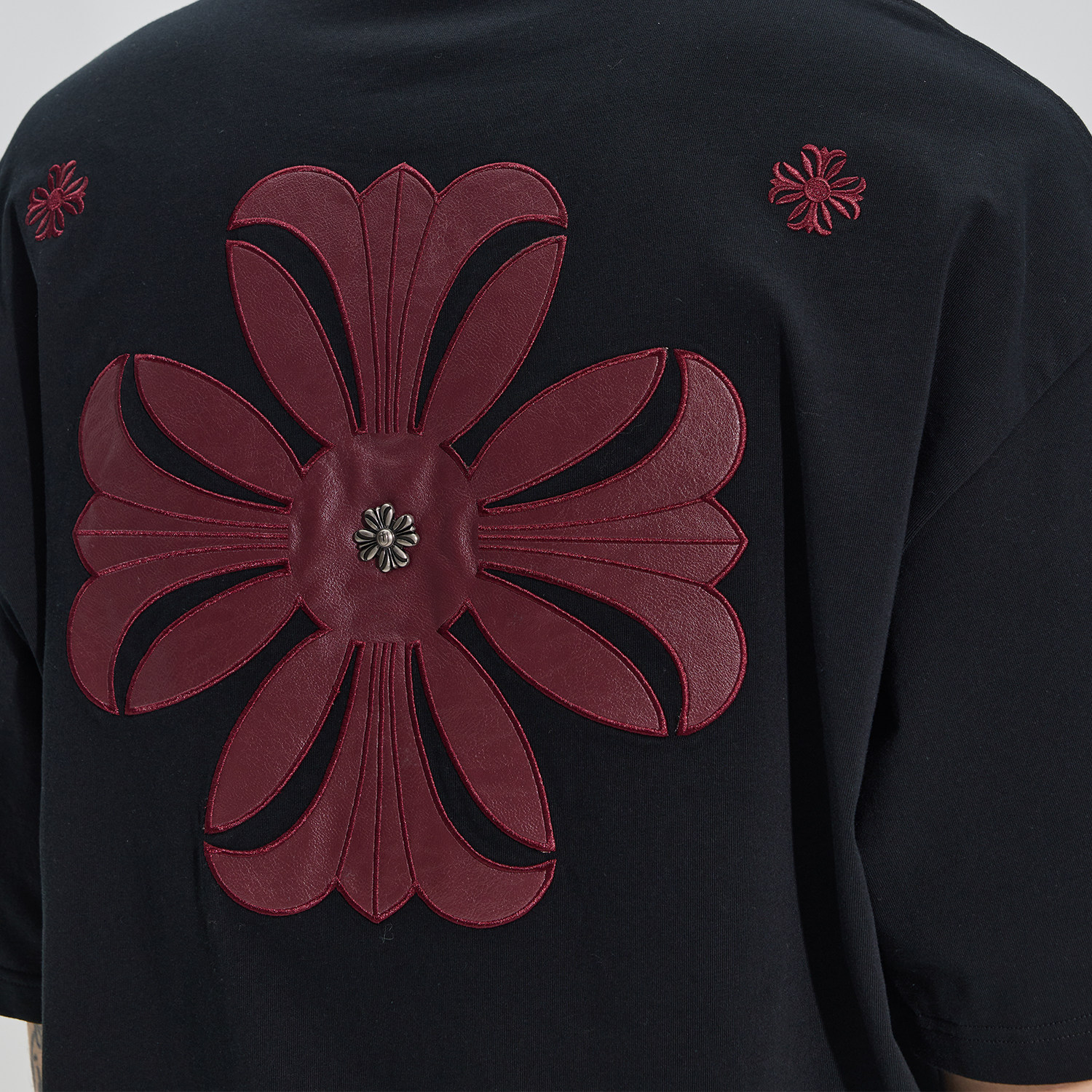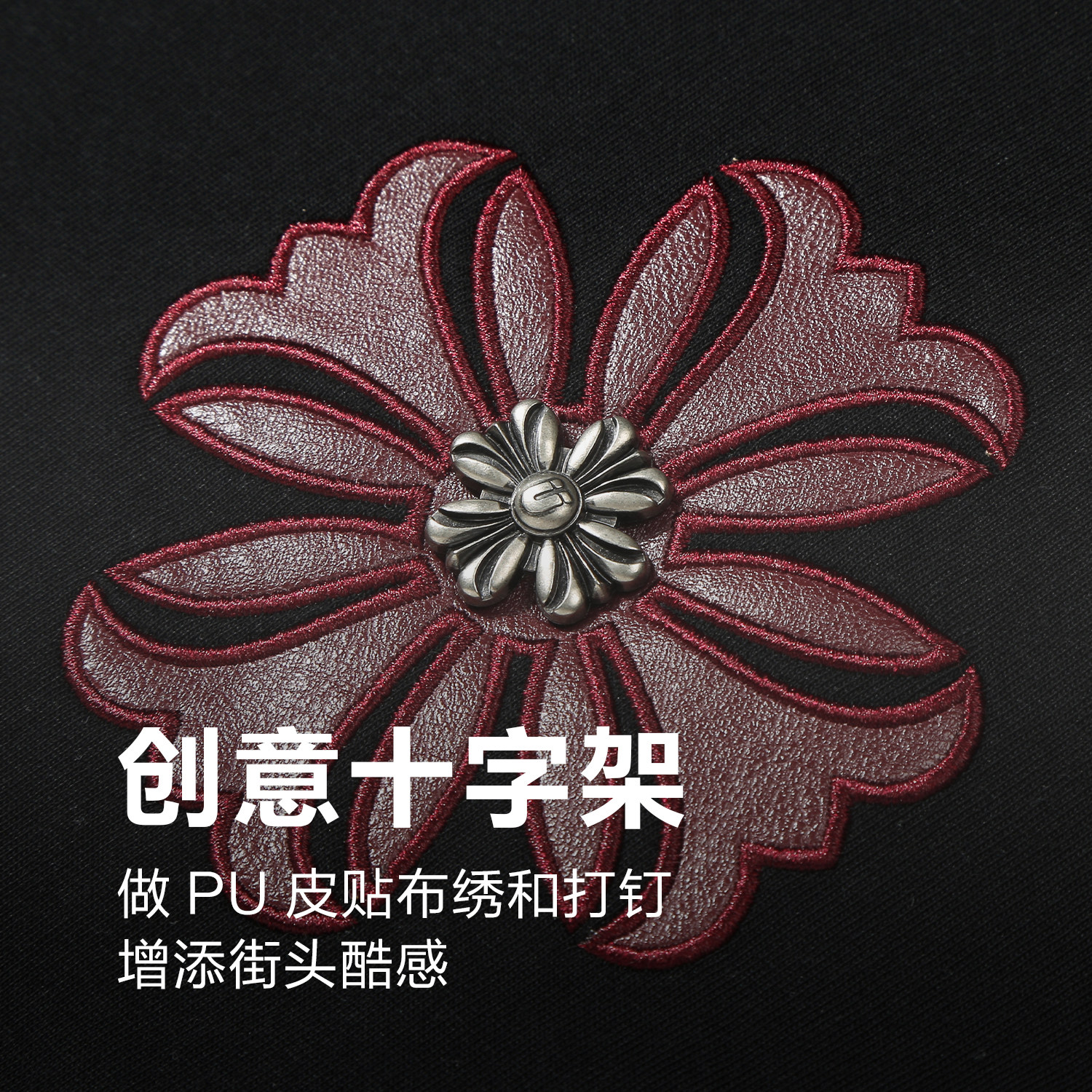 哥特风PU皮刺绣上衣 女t恤重磅纯棉半袖 GUUKA潮牌黑色美式 复古短袖