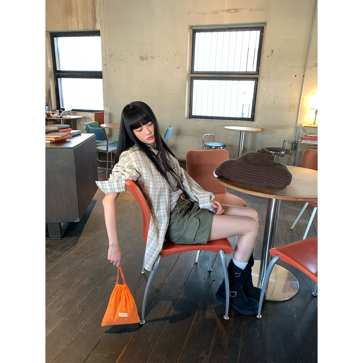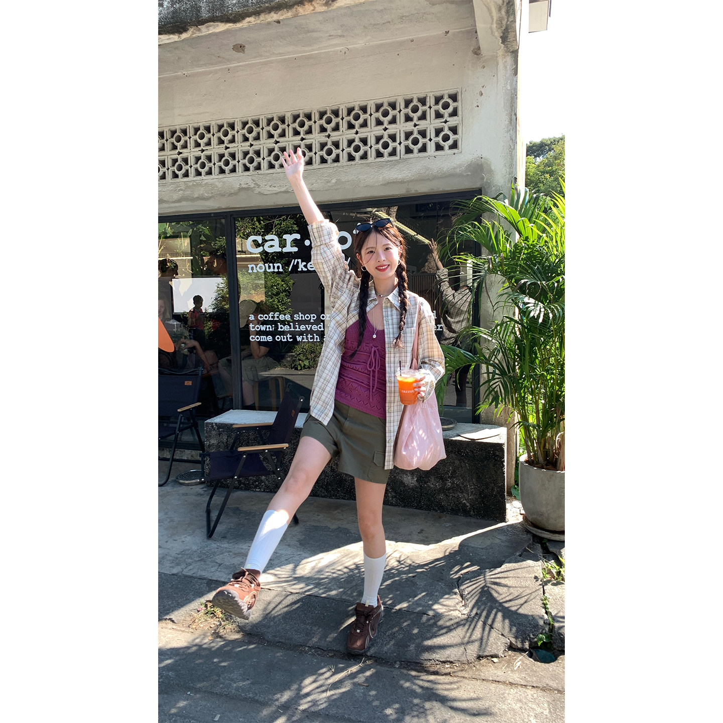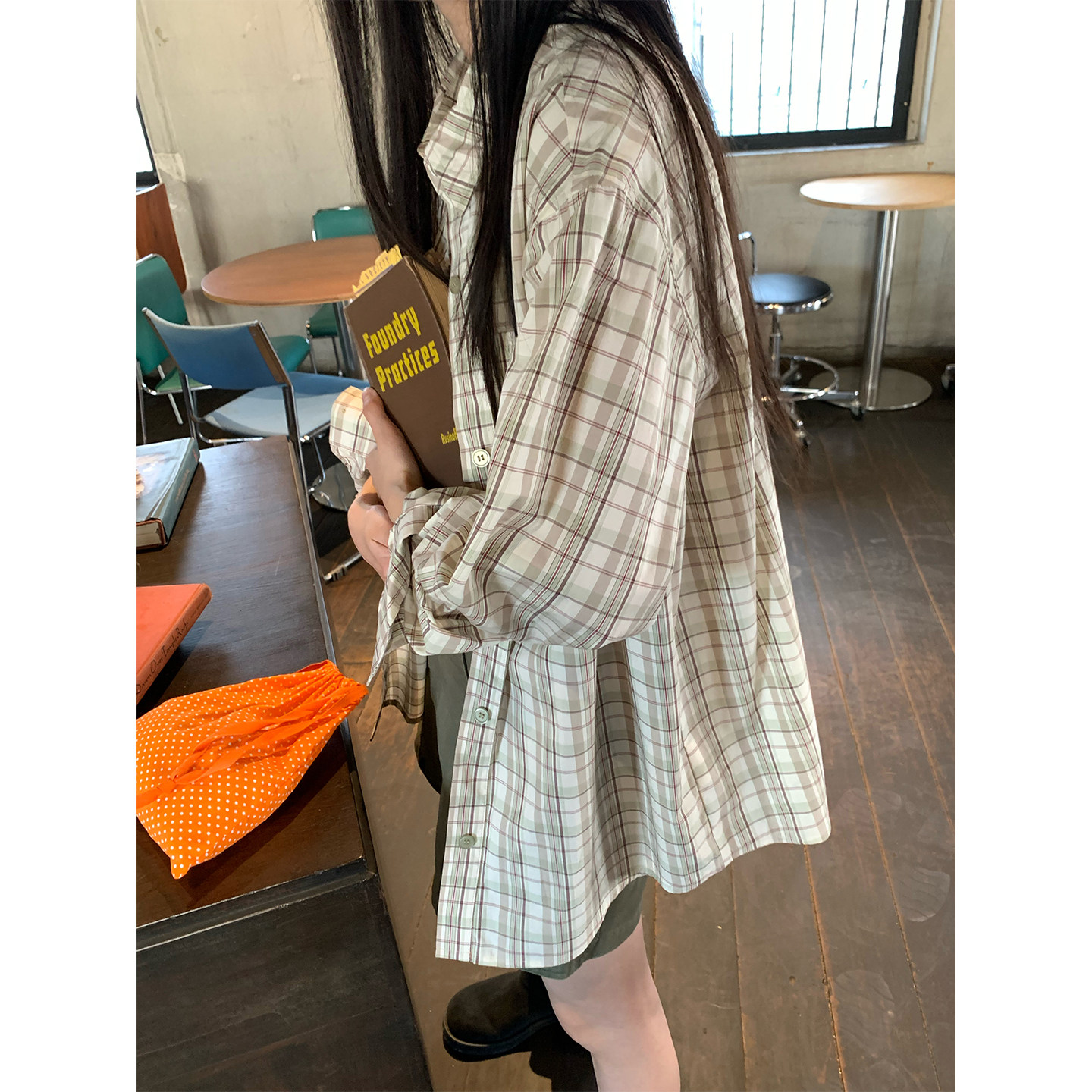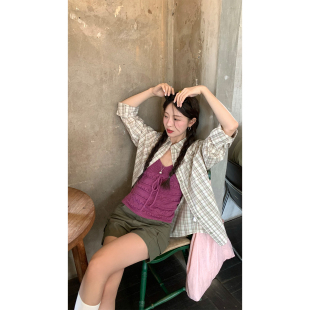 新款 2026夏季 100%棉港风衬衣薄外套女 复古杏绿格纹宽松衬衫 CCKOK